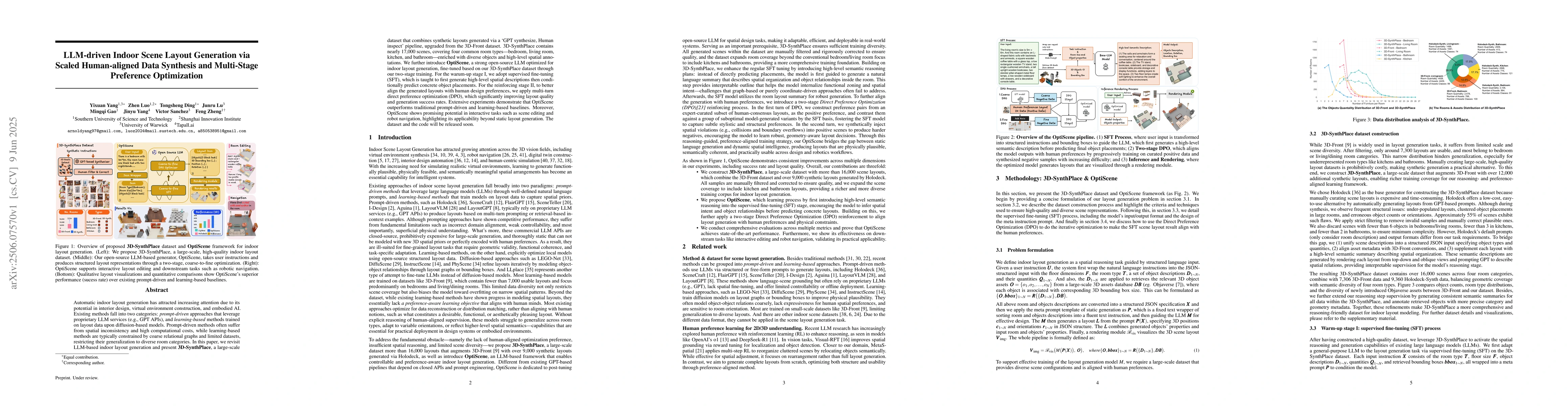 Automatic indoor layout generation has attracted increasing attention due to its potential in interior design, virtual environment construction, and embodied AI. Existing methods fall into two categories: prompt-driven approaches that leverage proprietary LLM services (e.g., GPT APIs) and learning-based methods trained on layout data upon diffusion-based models. Prompt-driven methods often suffer from spatial inconsistency and high computational costs, while learning-based methods are typically constrained by coarse relational graphs and limited datasets, restricting their generalization to diverse room categories. In this paper, we revisit LLM-based indoor layout generation and present 3D-SynthPlace, a large-scale dataset that combines synthetic layouts generated via a 'GPT synthesize, Human inspect' pipeline, upgraded from the 3D-Front dataset. 3D-SynthPlace contains nearly 17,000 scenes, covering four common room types -- bedroom, living room, kitchen, and bathroom -- enriched with diverse objects and high-level spatial annotations. We further introduce OptiScene, a strong open-source LLM optimized for indoor layout generation, fine-tuned based on our 3D-SynthPlace dataset through our two-stage training. For the warum-up stage I, we adopt supervised fine-tuning (SFT), which is taught to first generate high-level spatial descriptions then conditionally predict concrete object placements. For the reinforcing stage II, to better align the generated layouts with human design preferences, we apply multi-turn direct preference optimization (DPO), which significantly improving layout quality and generation success rates. Extensive experiments demonstrate that OptiScene outperforms traditional prompt-driven and learning-based baselines. Moreover, OptiScene shows promising potential in interactive tasks such as scene editing and robot navigation.