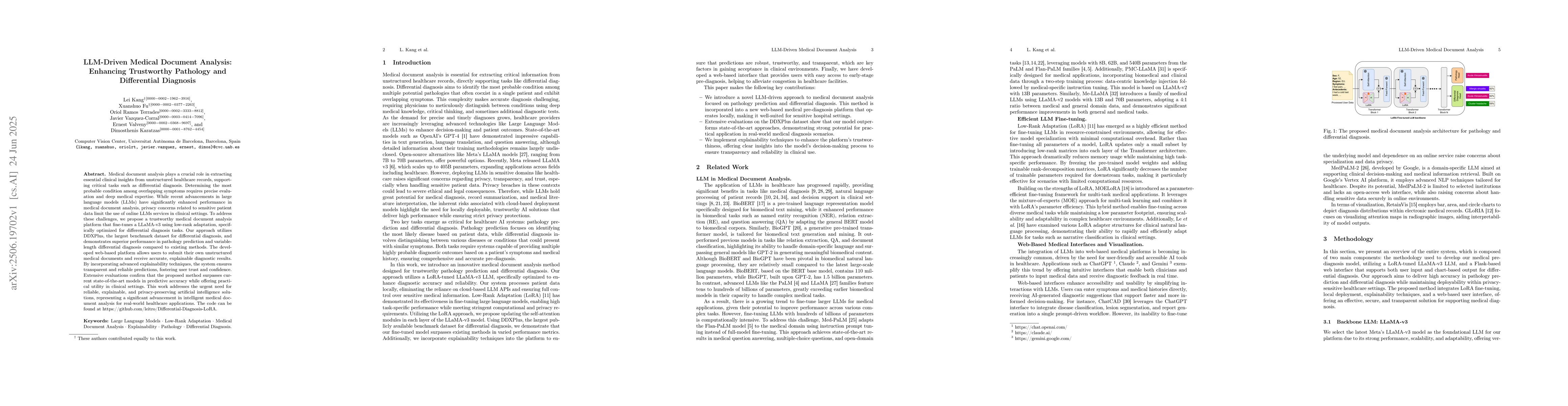 Medical document analysis plays a crucial role in extracting essential clinical insights from unstructured healthcare records, supporting critical tasks such as differential diagnosis. Determining the most probable condition among overlapping symptoms requires precise evaluation and deep medical expertise. While recent advancements in large language models (LLMs) have significantly enhanced performance in medical document analysis, privacy concerns related to sensitive patient data limit the use of online LLMs services in clinical settings. To address these challenges, we propose a trustworthy medical document analysis platform that fine-tunes a LLaMA-v3 using low-rank adaptation, specifically optimized for differential diagnosis tasks. Our approach utilizes DDXPlus, the largest benchmark dataset for differential diagnosis, and demonstrates superior performance in pathology prediction and variable-length differential diagnosis compared to existing methods. The developed web-based platform allows users to submit their own unstructured medical documents and receive accurate, explainable diagnostic results. By incorporating advanced explainability techniques, the system ensures transparent and reliable predictions, fostering user trust and confidence. Extensive evaluations confirm that the proposed method surpasses current state-of-the-art models in predictive accuracy while offering practical utility in clinical settings. This work addresses the urgent need for reliable, explainable, and privacy-preserving artificial intelligence solutions, representing a significant advancement in intelligent medical document analysis for real-world healthcare applications. The code can be found at \href{https://github.com/leitro/Differential-Diagnosis-LoRA}{https://github.com/leitro/Differential-Diagnosis-LoRA}.