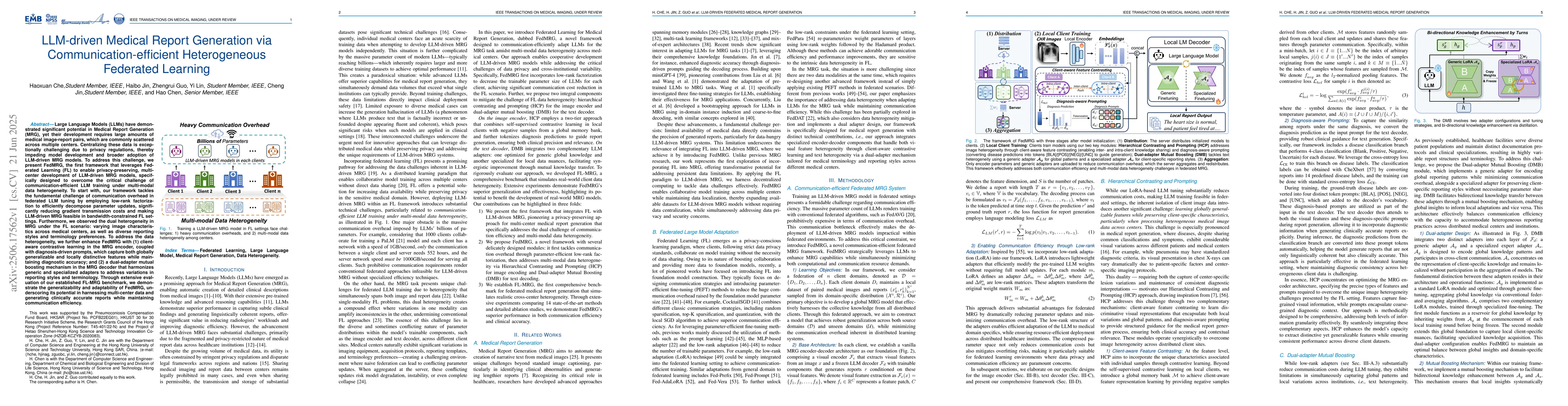 LLMs have demonstrated significant potential in Medical Report Generation (MRG), yet their development requires large amounts of medical image-report pairs, which are commonly scattered across multiple centers. Centralizing these data is exceptionally challenging due to privacy regulations, thereby impeding model development and broader adoption of LLM-driven MRG models. To address this challenge, we present FedMRG, the first framework that leverages Federated Learning (FL) to enable privacy-preserving, multi-center development of LLM-driven MRG models, specifically designed to overcome the critical challenge of communication-efficient LLM training under multi-modal data heterogeneity. To start with, our framework tackles the fundamental challenge of communication overhead in FL-LLM tuning by employing low-rank factorization to efficiently decompose parameter updates, significantly reducing gradient transmission costs and making LLM-driven MRG feasible in bandwidth-constrained FL settings. Furthermore, we observed the dual heterogeneity in MRG under the FL scenario: varying image characteristics across medical centers, as well as diverse reporting styles and terminology preferences. To address this, we further enhance FedMRG with (1) client-aware contrastive learning in the MRG encoder, coupled with diagnosis-driven prompts, which capture both globally generalizable and locally distinctive features while maintaining diagnostic accuracy; and (2) a dual-adapter mutual boosting mechanism in the MRG decoder that harmonizes generic and specialized adapters to address variations in reporting styles and terminology. Through extensive evaluation of our established FL-MRG benchmark, we demonstrate the generalizability and adaptability of FedMRG, underscoring its potential in harnessing multi-center data and generating clinically accurate reports while maintaining communication efficiency.