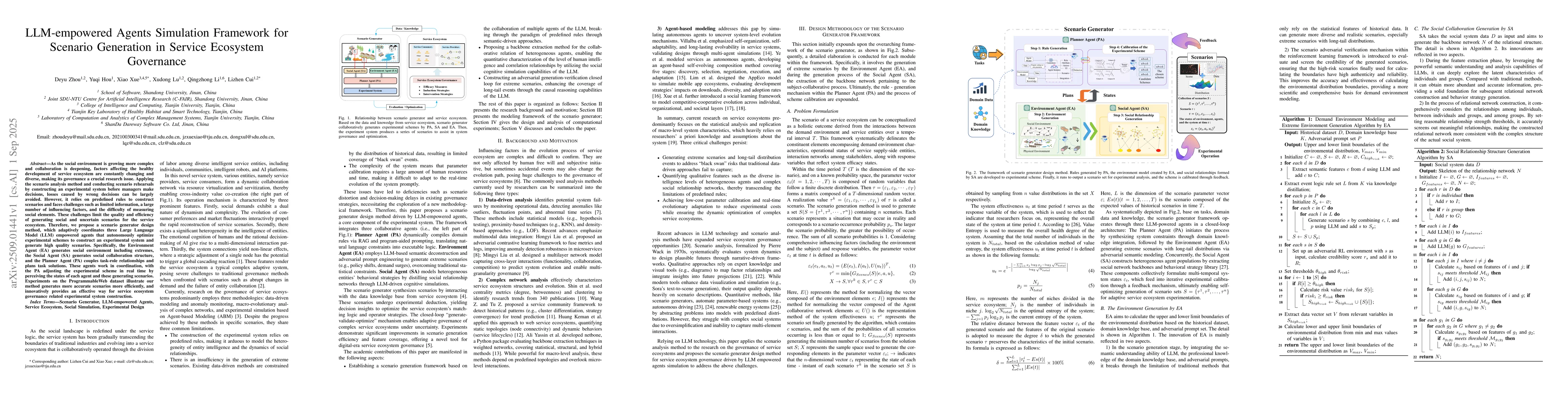 As the social environment is growing more complex and collaboration is deepening, factors affecting the healthy development of service ecosystem are constantly changing and diverse, making its governance a crucial research issue. Applying the scenario analysis method and conducting scenario rehearsals by constructing an experimental system before managers make decisions, losses caused by wrong decisions can be largely avoided. However, it relies on predefined rules to construct scenarios and faces challenges such as limited information, a large number of influencing factors, and the difficulty of measuring social elements. These challenges limit the quality and efficiency of generating social and uncertain scenarios for the service ecosystem. Therefore, we propose a scenario generator design method, which adaptively coordinates three Large Language Model (LLM) empowered agents that autonomously optimize experimental schemes to construct an experimental system and generate high quality scenarios. Specifically, the Environment Agent (EA) generates social environment including extremes, the Social Agent (SA) generates social collaboration structure, and the Planner Agent (PA) couples task-role relationships and plans task solutions. These agents work in coordination, with the PA adjusting the experimental scheme in real time by perceiving the states of each agent and these generating scenarios. Experiments on the ProgrammableWeb dataset illustrate our method generates more accurate scenarios more efficiently, and innovatively provides an effective way for service ecosystem governance related experimental system construction.