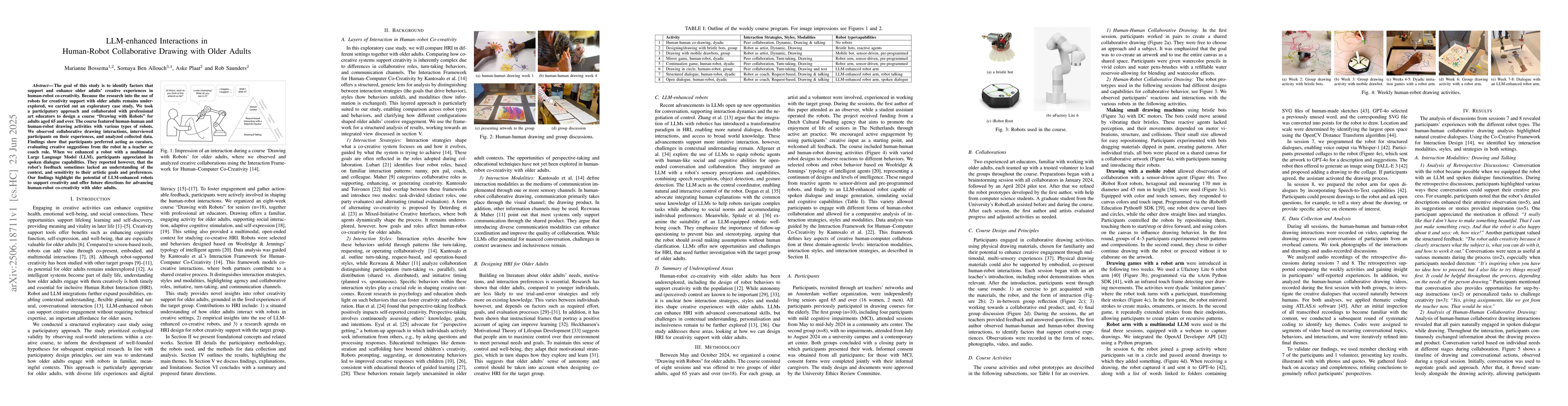 The goal of this study is to identify factors that support and enhance older adults' creative experiences in human-robot co-creativity. Because the research into the use of robots for creativity support with older adults remains underexplored, we carried out an exploratory case study. We took a participatory approach and collaborated with professional art educators to design a course Drawing with Robots for adults aged 65 and over. The course featured human-human and human-robot drawing activities with various types of robots. We observed collaborative drawing interactions, interviewed participants on their experiences, and analyzed collected data. Findings show that participants preferred acting as curators, evaluating creative suggestions from the robot in a teacher or coach role. When we enhanced a robot with a multimodal Large Language Model (LLM), participants appreciated its spoken dialogue capabilities. They reported however, that the robot's feedback sometimes lacked an understanding of the context, and sensitivity to their artistic goals and preferences. Our findings highlight the potential of LLM-enhanced robots to support creativity and offer future directions for advancing human-robot co-creativity with older adults.