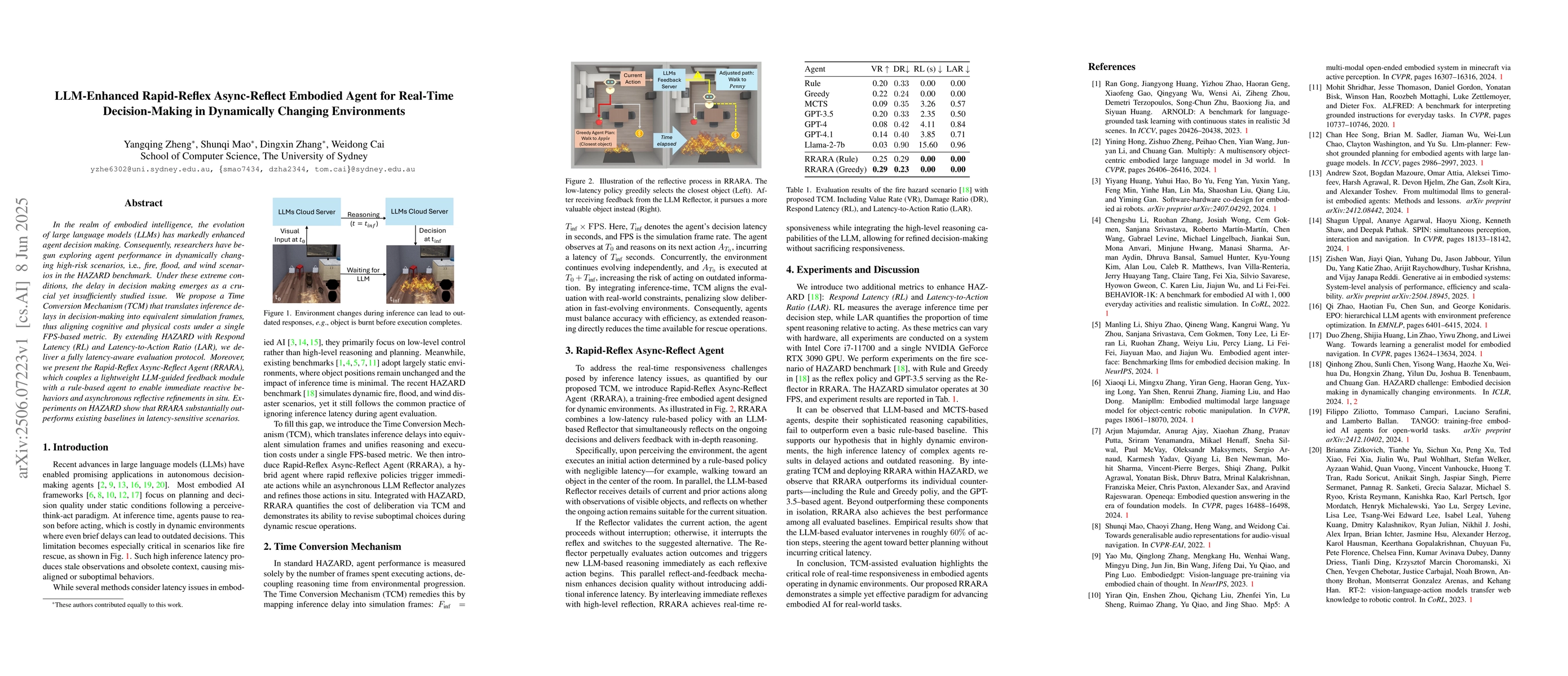 In the realm of embodied intelligence, the evolution of large language models (LLMs) has markedly enhanced agent decision making. Consequently, researchers have begun exploring agent performance in dynamically changing high-risk scenarios, i.e., fire, flood, and wind scenarios in the HAZARD benchmark. Under these extreme conditions, the delay in decision making emerges as a crucial yet insufficiently studied issue. We propose a Time Conversion Mechanism (TCM) that translates inference delays in decision-making into equivalent simulation frames, thus aligning cognitive and physical costs under a single FPS-based metric. By extending HAZARD with Respond Latency (RL) and Latency-to-Action Ratio (LAR), we deliver a fully latency-aware evaluation protocol. Moreover, we present the Rapid-Reflex Async-Reflect Agent (RRARA), which couples a lightweight LLM-guided feedback module with a rule-based agent to enable immediate reactive behaviors and asynchronous reflective refinements in situ. Experiments on HAZARD show that RRARA substantially outperforms existing baselines in latency-sensitive scenarios.
