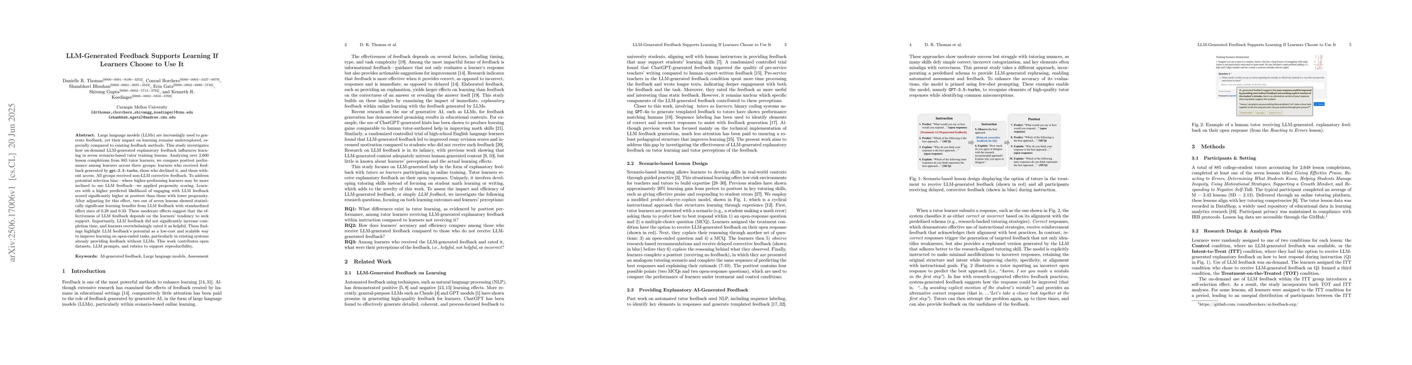 This study examines the impact of LLM-generated feedback on learning in tutor training lessons, involving 885 learners. Results indicate that LLM feedback significantly improved learning in certain lessons (effect sizes 0.28 and 0.33), but its effectiveness depends on learners' inclination to utilize it. The feedback didn't increase completion time and was generally deemed helpful, suggesting its potential as a cost-effective learning tool.
