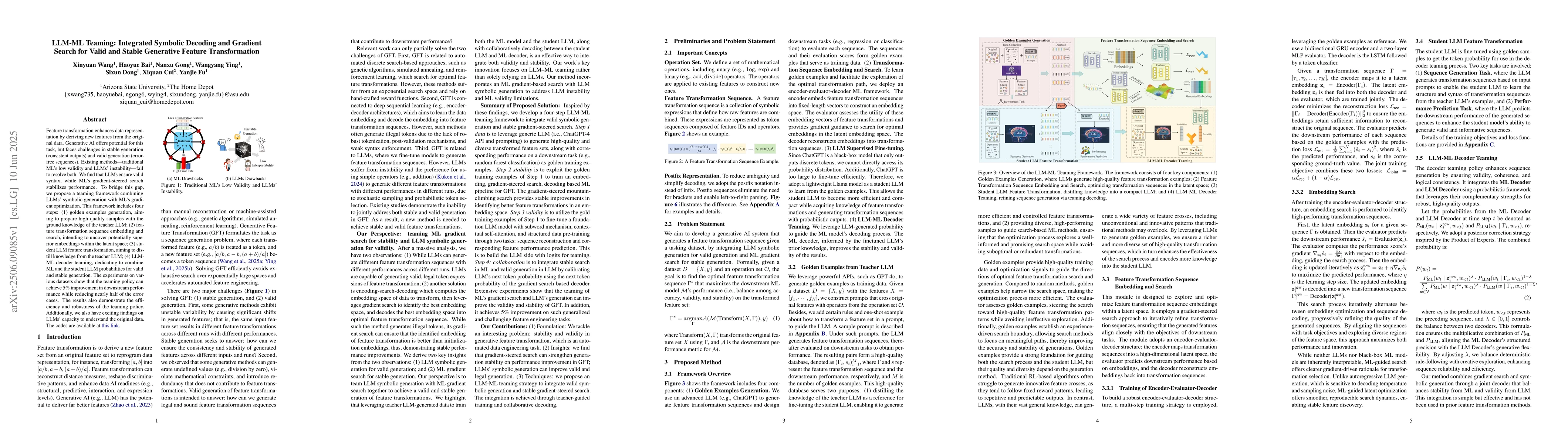 Feature transformation enhances data representation by deriving new features from the original data. Generative AI offers potential for this task, but faces challenges in stable generation (consistent outputs) and valid generation (error-free sequences). Existing methods--traditional MLs' low validity and LLMs' instability--fail to resolve both. We find that LLMs ensure valid syntax, while ML's gradient-steered search stabilizes performance. To bridge this gap, we propose a teaming framework combining LLMs' symbolic generation with ML's gradient optimization. This framework includes four steps: (1) golden examples generation, aiming to prepare high-quality samples with the ground knowledge of the teacher LLM; (2) feature transformation sequence embedding and search, intending to uncover potentially superior embeddings within the latent space; (3) student LLM feature transformation, aiming to distill knowledge from the teacher LLM; (4) LLM-ML decoder teaming, dedicating to combine ML and the student LLM probabilities for valid and stable generation. The experiments on various datasets show that the teaming policy can achieve 5\% improvement in downstream performance while reducing nearly half of the error cases. The results also demonstrate the efficiency and robustness of the teaming policy. Additionally, we also have exciting findings on LLMs' capacity to understand the original data.