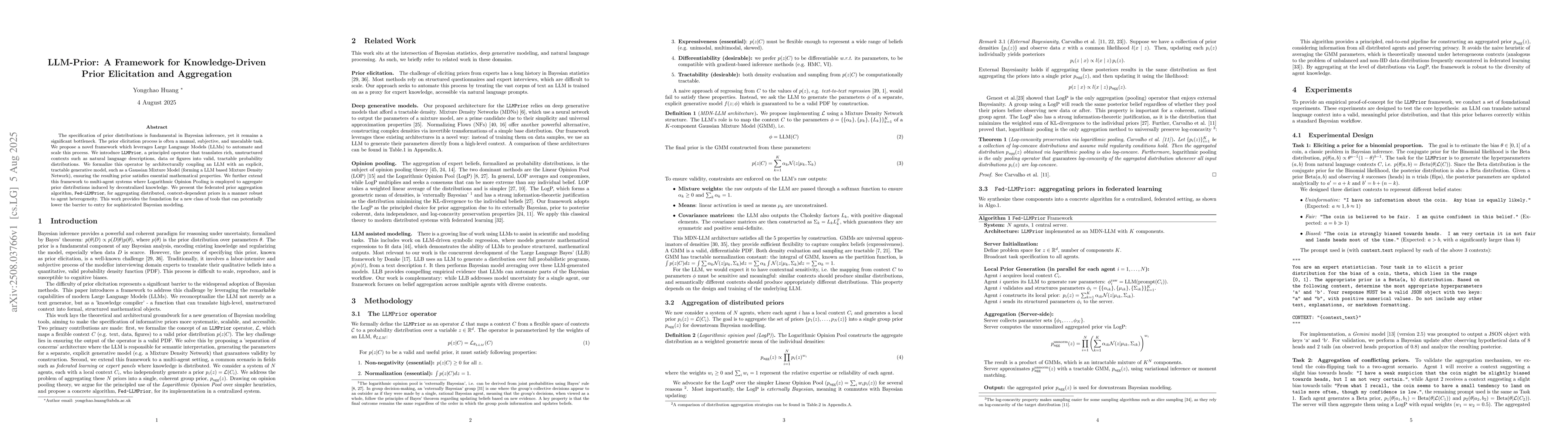 The specification of prior distributions is fundamental in Bayesian inference, yet it remains a significant bottleneck. The prior elicitation process is often a manual, subjective, and unscalable task. We propose a novel framework which leverages Large Language Models (LLMs) to automate and scale this process. We introduce \texttt{LLMPrior}, a principled operator that translates rich, unstructured contexts such as natural language descriptions, data or figures into valid, tractable probability distributions. We formalize this operator by architecturally coupling an LLM with an explicit, tractable generative model, such as a Gaussian Mixture Model (forming a LLM based Mixture Density Network), ensuring the resulting prior satisfies essential mathematical properties. We further extend this framework to multi-agent systems where Logarithmic Opinion Pooling is employed to aggregate prior distributions induced by decentralized knowledge. We present the federated prior aggregation algorithm, \texttt{Fed-LLMPrior}, for aggregating distributed, context-dependent priors in a manner robust to agent heterogeneity. This work provides the foundation for a new class of tools that can potentially lower the barrier to entry for sophisticated Bayesian modeling.