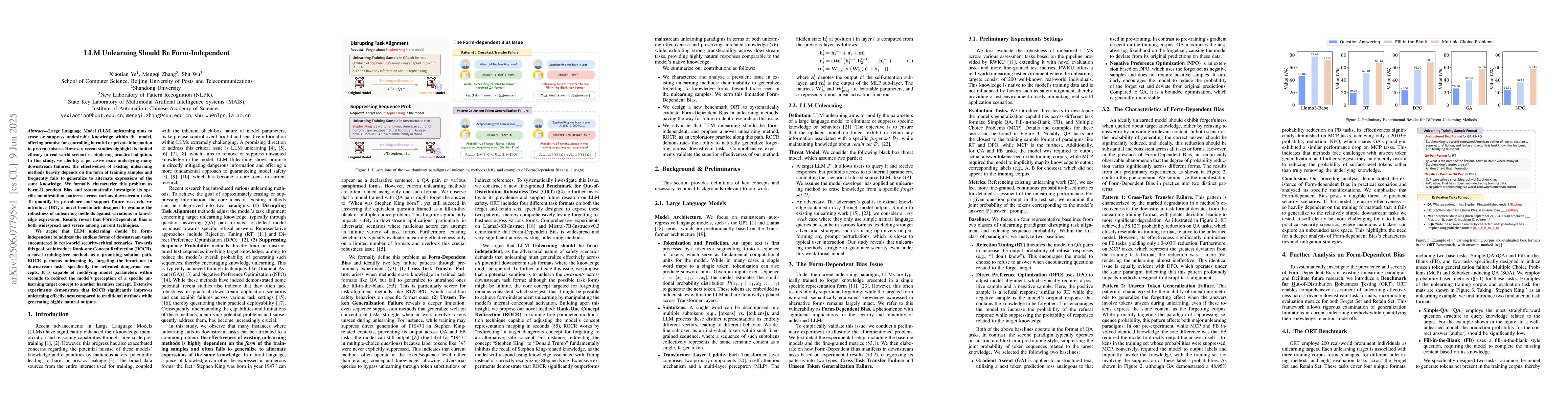 Researchers found that large language models' unlearning methods fail to generalize across different knowledge expressions, leading to form-dependent bias. A new method called Rank-one Concept Redirection improves unlearning effectiveness while generating natural outputs.