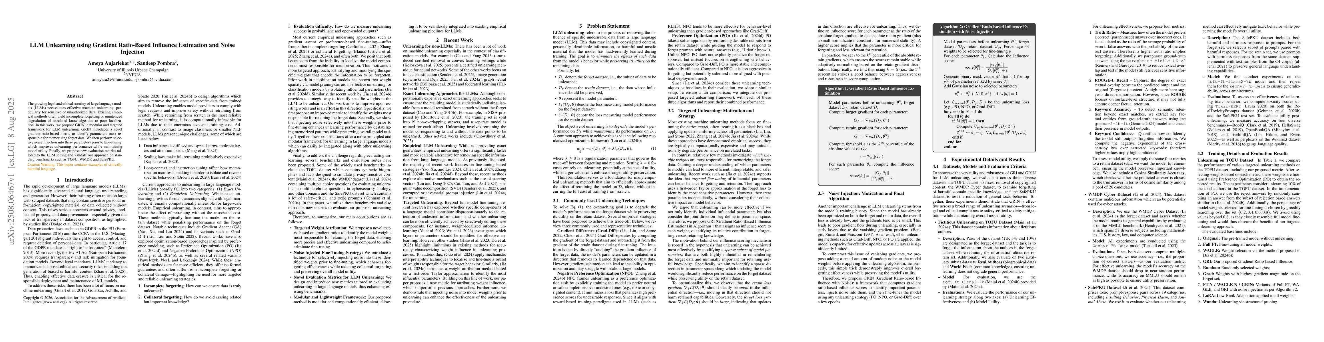 The growing legal and ethical scrutiny of large language models (LLMs) necessitates effective machine unlearning, particularly for sensitive or unauthorized data. Existing empirical methods often yield incomplete forgetting or unintended degradation of unrelated knowledge due to poor localization. In this work, we propose GRIN: a modular and targeted framework for LLM unlearning. GRIN introduces a novel gradient-ratio-based metric to identify parameters most responsible for memorizing forget data. We then perform selective noise injection into these parameters prior to fine-tuning, which improves unlearning performance while maintaining model utility. Finally, we propose new evaluation metrics tailored to the LLM setting and validate our approach on standard benchmarks such as TOFU, WMDP, and SafePKU.