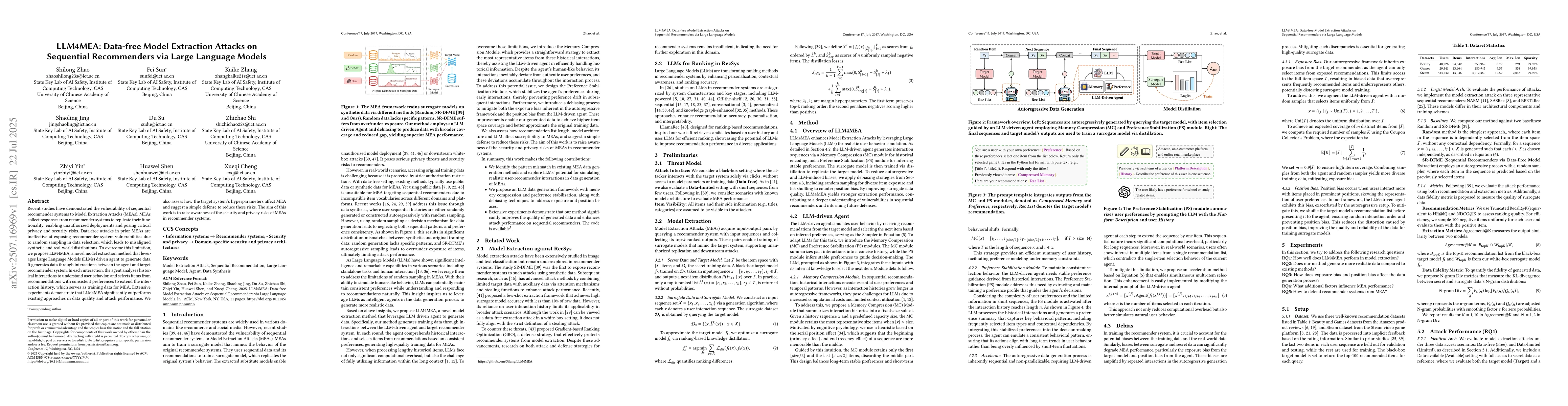 The paper introduces LLM4MEA, a novel method using Large Language Models to generate data for Model Extraction Attacks on sequential recommender systems, significantly improving data quality and attack performance while proposing defense strategies.
