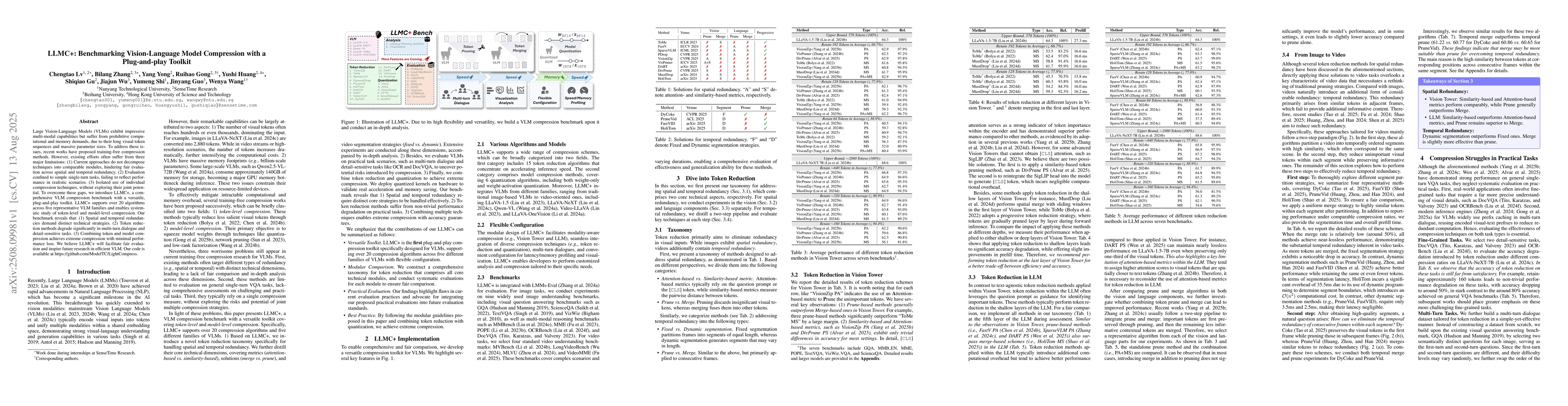 Large Vision-Language Models (VLMs) exhibit impressive multi-modal capabilities but suffer from prohibitive computational and memory demands, due to their long visual token sequences and massive parameter sizes. To address these issues, recent works have proposed training-free compression methods. However, existing efforts often suffer from three major limitations: (1) Current approaches do not decompose techniques into comparable modules, hindering fair evaluation across spatial and temporal redundancy. (2) Evaluation confined to simple single-turn tasks, failing to reflect performance in realistic scenarios. (3) Isolated use of individual compression techniques, without exploring their joint potential. To overcome these gaps, we introduce LLMC+, a comprehensive VLM compression benchmark with a versatile, plug-and-play toolkit. LLMC+ supports over 20 algorithms across five representative VLM families and enables systematic study of token-level and model-level compression. Our benchmark reveals that: (1) Spatial and temporal redundancies demand distinct technical strategies. (2) Token reduction methods degrade significantly in multi-turn dialogue and detail-sensitive tasks. (3) Combining token and model compression achieves extreme compression with minimal performance loss. We believe LLMC+ will facilitate fair evaluation and inspire future research in efficient VLM. Our code is available at https://github.com/ModelTC/LightCompress.