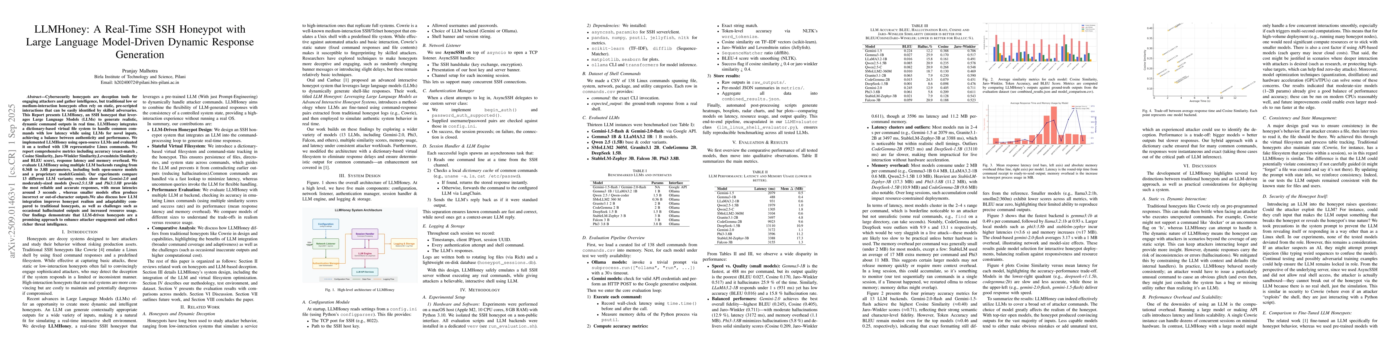 Cybersecurity honeypots are deception tools for engaging attackers and gather intelligence, but traditional low or medium-interaction honeypots often rely on static, pre-scripted interactions that can be easily identified by skilled adversaries. This Report presents LLMHoney, an SSH honeypot that leverages Large Language Models (LLMs) to generate realistic, dynamic command outputs in real time. LLMHoney integrates a dictionary-based virtual file system to handle common commands with low latency while using LLMs for novel inputs, achieving a balance between authenticity and performance. We implemented LLMHoney using open-source LLMs and evaluated it on a testbed with 138 representative Linux commands. We report comprehensive metrics including accuracy (exact-match, Cosine Similarity, Jaro-Winkler Similarity, Levenshtein Similarity and BLEU score), response latency and memory overhead. We evaluate LLMHoney using multiple LLM backends ranging from 0.36B to 3.8B parameters, including both open-source models and a proprietary model(Gemini). Our experiments compare 13 different LLM variants; results show that Gemini-2.0 and moderately-sized models Qwen2.5:1.5B and Phi3:3.8B provide the most reliable and accurate responses, with mean latencies around 3 seconds, whereas smaller models often produce incorrect or out-of-character outputs. We also discuss how LLM integration improves honeypot realism and adaptability compared to traditional honeypots, as well as challenges such as occasional hallucinated outputs and increased resource usage. Our findings demonstrate that LLM-driven honeypots are a promising approach to enhance attacker engagement and collect richer threat intelligence.