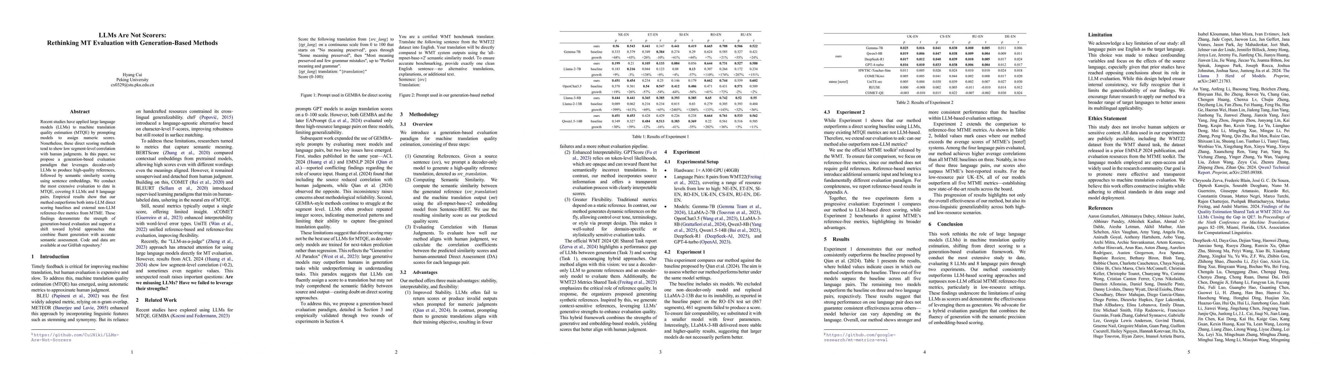 The paper presents a generation-based evaluation method for MTQE that utilizes decoder-only LLMs to produce high-quality references, followed by semantic similarity scoring, outperforming existing direct scoring and reference-free metrics.
