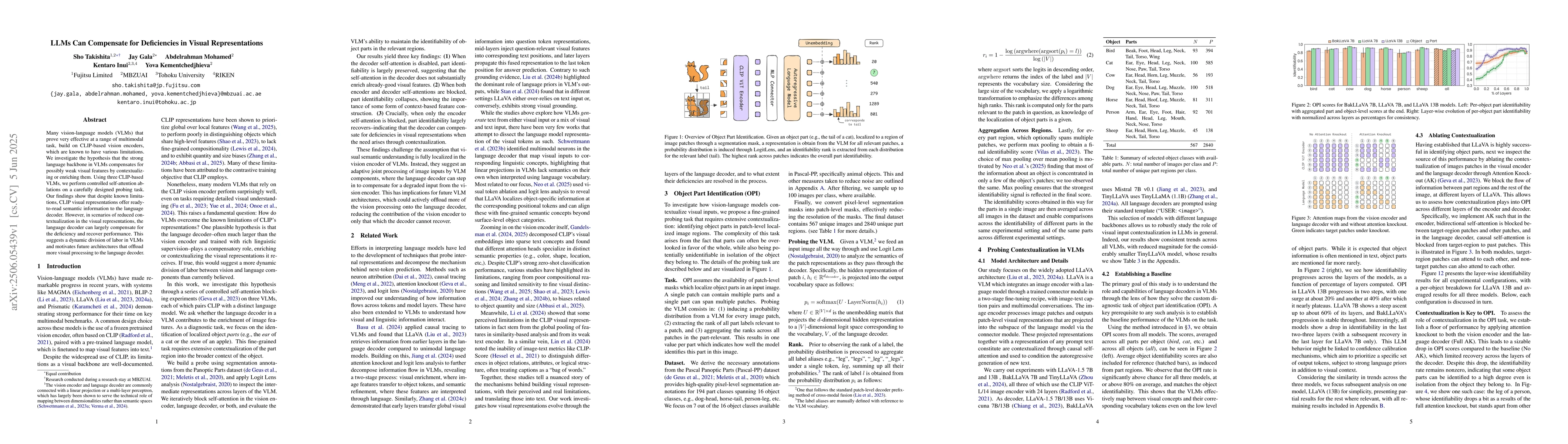 Many vision-language models (VLMs) that prove very effective at a range of multimodal task, build on CLIP-based vision encoders, which are known to have various limitations. We investigate the hypothesis that the strong language backbone in VLMs compensates for possibly weak visual features by contextualizing or enriching them. Using three CLIP-based VLMs, we perform controlled self-attention ablations on a carefully designed probing task. Our findings show that despite known limitations, CLIP visual representations offer ready-to-read semantic information to the language decoder. However, in scenarios of reduced contextualization in the visual representations, the language decoder can largely compensate for the deficiency and recover performance. This suggests a dynamic division of labor in VLMs and motivates future architectures that offload more visual processing to the language decoder.