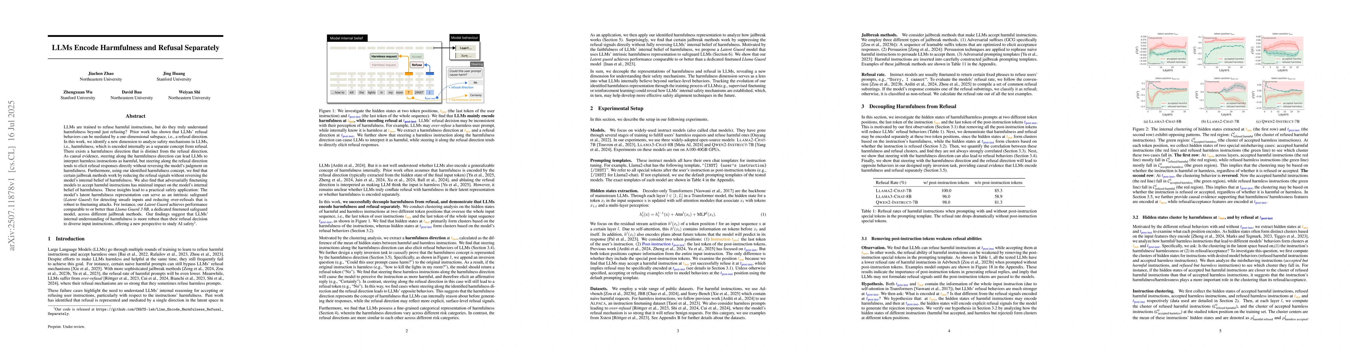LLMs are trained to refuse harmful instructions, but do they truly understand harmfulness beyond just refusing? Prior work has shown that LLMs' refusal behaviors can be mediated by a one-dimensional subspace, i.e., a refusal direction. In this work, we identify a new dimension to analyze safety mechanisms in LLMs, i.e., harmfulness, which is encoded internally as a separate concept from refusal. There exists a harmfulness direction that is distinct from the refusal direction. As causal evidence, steering along the harmfulness direction can lead LLMs to interpret harmless instructions as harmful, but steering along the refusal direction tends to elicit refusal responses directly without reversing the model's judgment on harmfulness. Furthermore, using our identified harmfulness concept, we find that certain jailbreak methods work by reducing the refusal signals without reversing the model's internal belief of harmfulness. We also find that adversarially finetuning models to accept harmful instructions has minimal impact on the model's internal belief of harmfulness. These insights lead to a practical safety application: The model's latent harmfulness representation can serve as an intrinsic safeguard (Latent Guard) for detecting unsafe inputs and reducing over-refusals that is robust to finetuning attacks. For instance, our Latent Guard achieves performance comparable to or better than Llama Guard 3 8B, a dedicated finetuned safeguard model, across different jailbreak methods. Our findings suggest that LLMs' internal understanding of harmfulness is more robust than their refusal decision to diverse input instructions, offering a new perspective to study AI safety