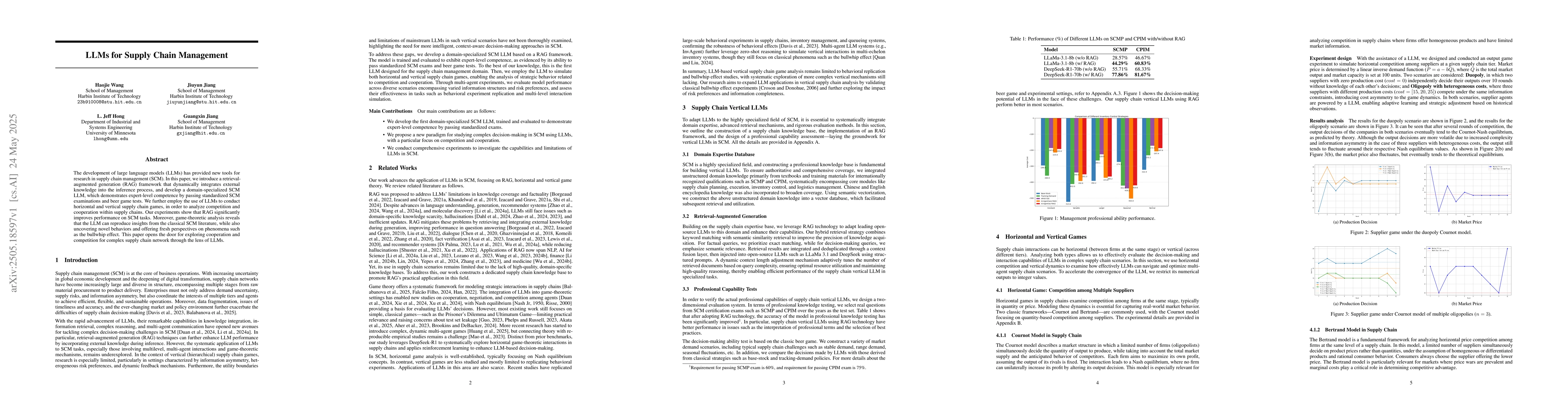 The development of large language models (LLMs) has provided new tools for research in supply chain management (SCM). In this paper, we introduce a retrieval-augmented generation (RAG) framework that dynamically integrates external knowledge into the inference process, and develop a domain-specialized SCM LLM, which demonstrates expert-level competence by passing standardized SCM examinations and beer game tests. We further employ the use of LLMs to conduct horizontal and vertical supply chain games, in order to analyze competition and cooperation within supply chains. Our experiments show that RAG significantly improves performance on SCM tasks. Moreover, game-theoretic analysis reveals that the LLM can reproduce insights from the classical SCM literature, while also uncovering novel behaviors and offering fresh perspectives on phenomena such as the bullwhip effect. This paper opens the door for exploring cooperation and competition for complex supply chain network through the lens of LLMs.