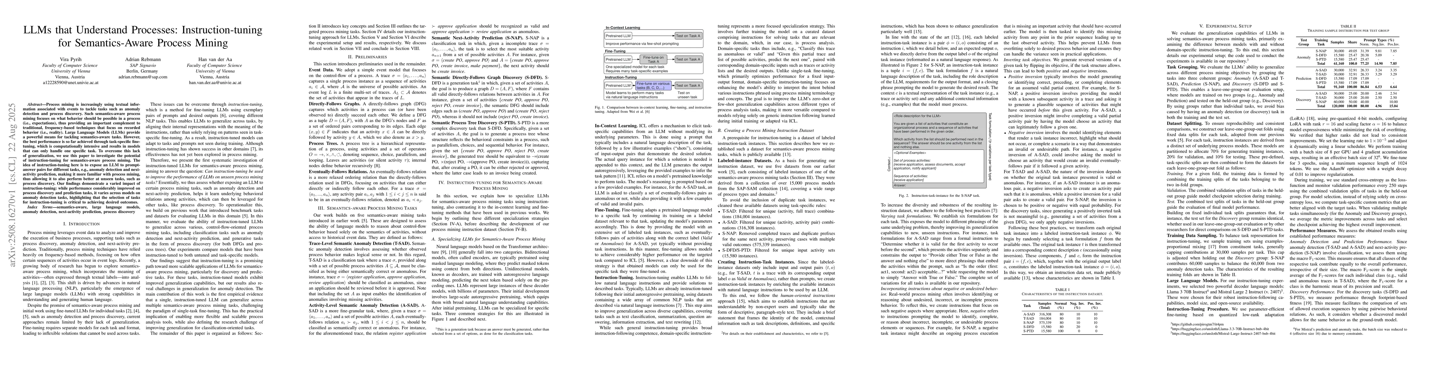 Process mining is increasingly using textual information associated with events to tackle tasks such as anomaly detection and process discovery. Such semantics-aware process mining focuses on what behavior should be possible in a process (i.e., expectations), thus providing an important complement to traditional, frequency-based techniques that focus on recorded behavior (i.e., reality). Large Language Models (LLMs) provide a powerful means for tackling semantics-aware tasks. However, the best performance is so far achieved through task-specific fine-tuning, which is computationally intensive and results in models that can only handle one specific task. To overcome this lack of generalization, we use this paper to investigate the potential of instruction-tuning for semantics-aware process mining. The idea of instruction-tuning here is to expose an LLM to prompt-answer pairs for different tasks, e.g., anomaly detection and next-activity prediction, making it more familiar with process mining, thus allowing it to also perform better at unseen tasks, such as process discovery. Our findings demonstrate a varied impact of instruction-tuning: while performance considerably improved on process discovery and prediction tasks, it varies across models on anomaly detection tasks, highlighting that the selection of tasks for instruction-tuning is critical to achieving desired outcomes.