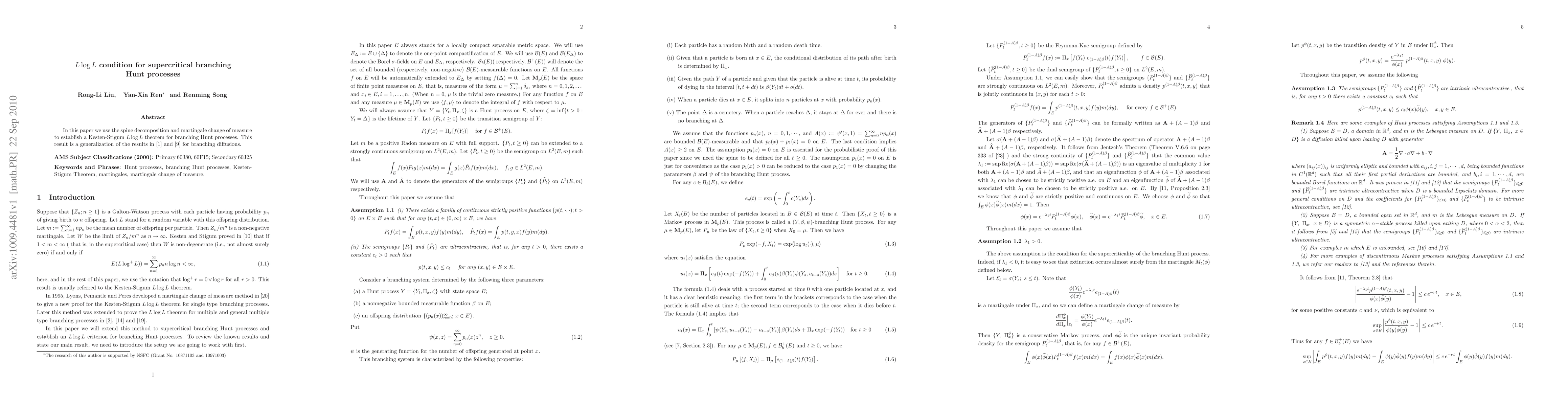 This paper establishes a Kesten-Stigum $L\log L$ theorem for supercritical branching Hunt processes using spine decomposition and martingale change of measure, extending previous results from branching diffusions.