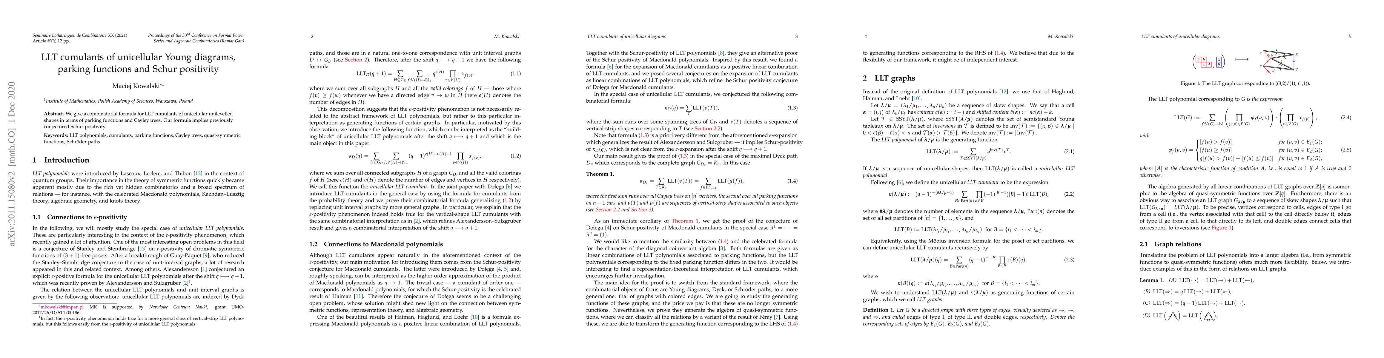 This paper provides a combinatorial formula for LLT cumulants of unicellular unilevelled shapes using parking functions and Cayley trees, thereby confirming the previously conjectured Schur positivity.