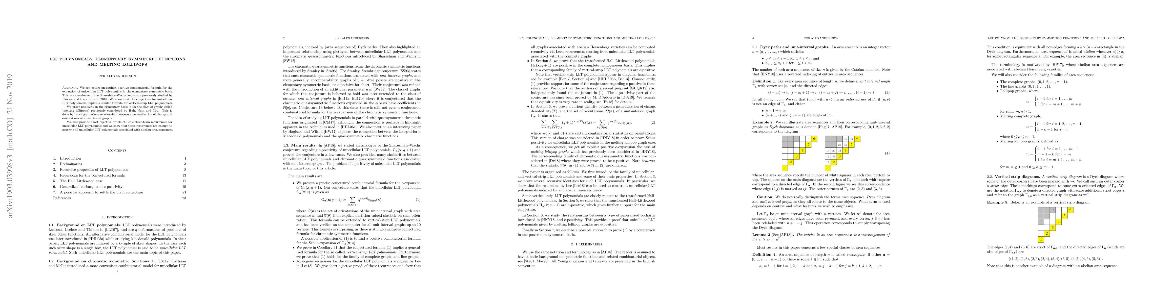 This paper proposes a positive combinatorial formula for the expansion of unicellular LLT polynomials in terms of elementary symmetric functions, analogous to the Shareshian-Wachs conjecture. It proves the conjecture for a class of graphs called "melting lollipops" and provides bijective proofs of Lee's recurrences for unicellular LLT polynomials.