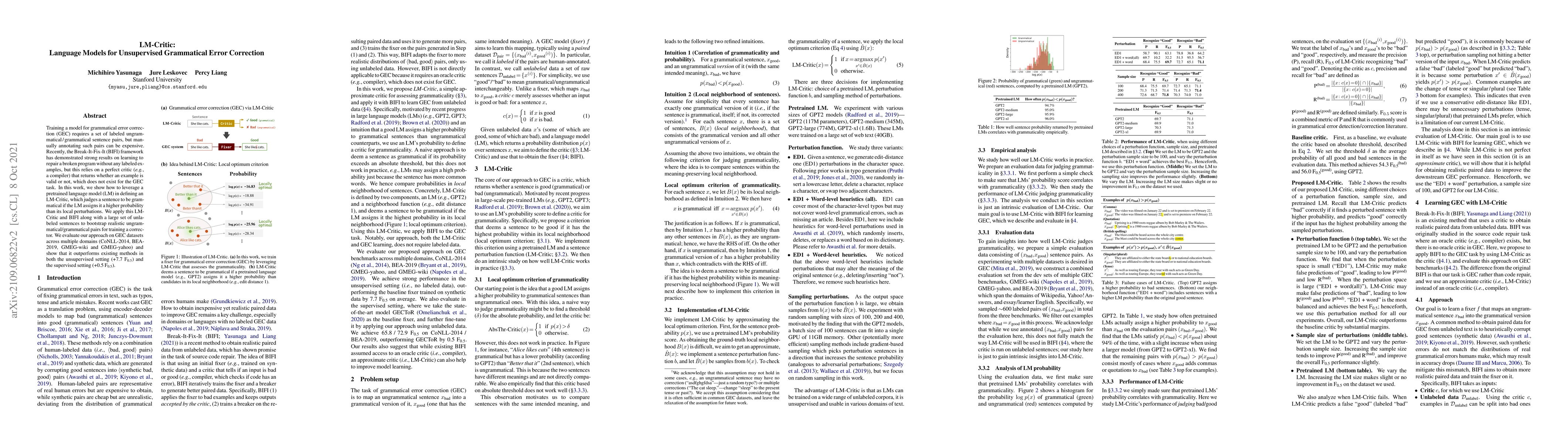 This paper introduces LM-Critic, a method using a pretrained language model to assess grammaticality by comparing sentence probabilities to their local perturbations, enabling unsupervised grammatical error correction. It combines this with the BIFI framework to generate labeled training pairs from unlabeled data, achieving superior performance on various GEC datasets compared to existing methods.