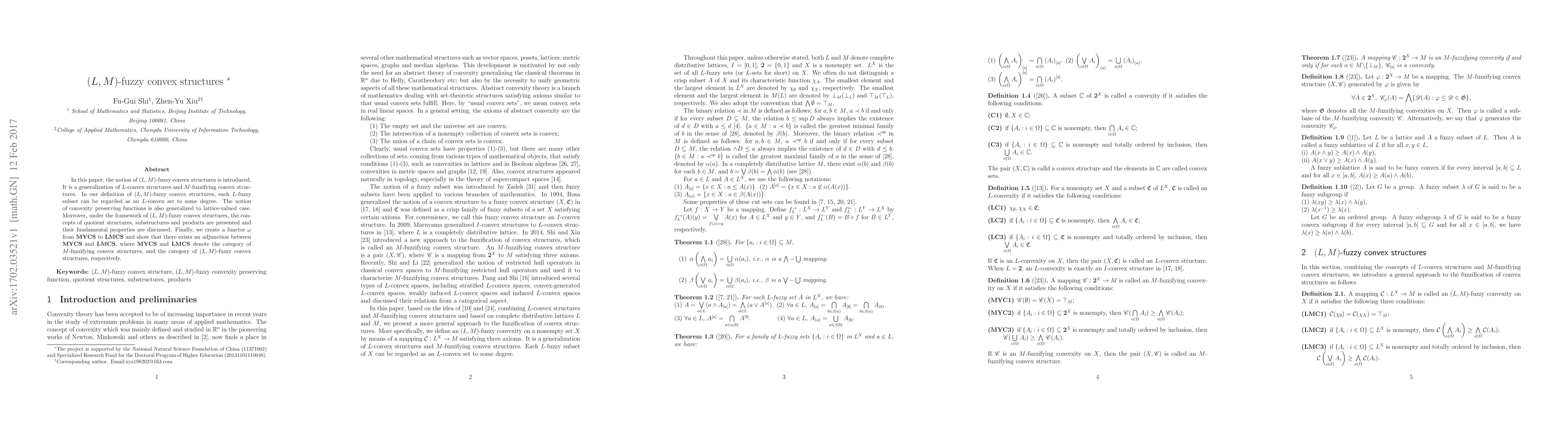 This paper introduces $(L,M)$-fuzzy convex structures, generalizing $L$-convex structures and $M$-fuzzifying convex structures. It discusses convexity preserving functions in the lattice-valued context and explores quotient structures, substructures, and products within this framework.