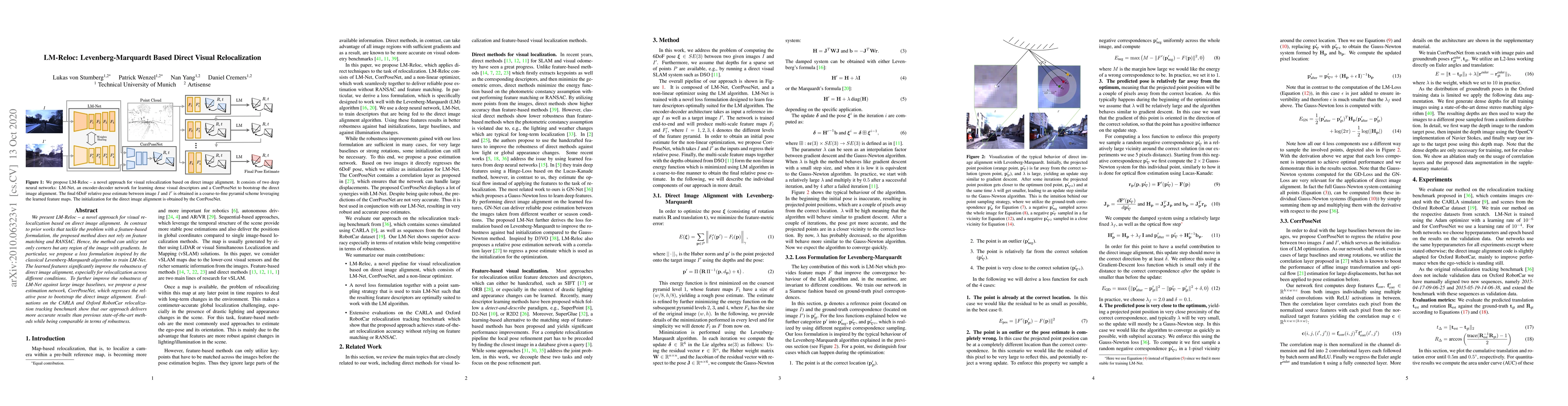 LM-Reloc introduces a novel visual relocalization method based on direct image alignment using the Levenberg-Marquardt algorithm, bypassing feature matching and RANSAC for improved robustness across varying conditions. It also employs CorrPoseNet for enhanced pose estimation, achieving superior accuracy compared to prior methods in benchmarks.