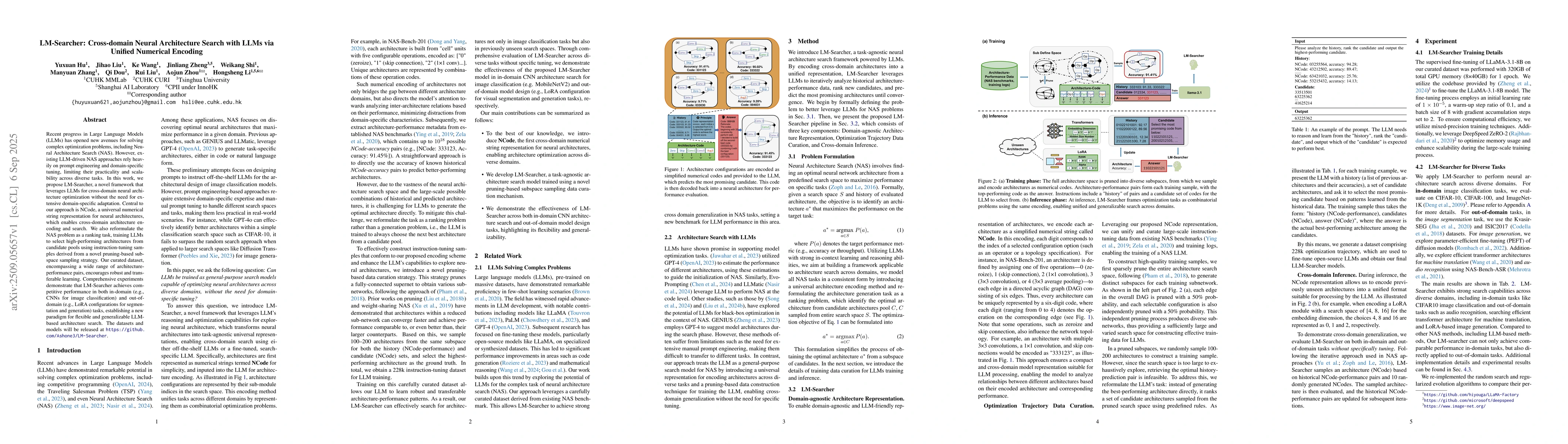 Recent progress in Large Language Models (LLMs) has opened new avenues for solving complex optimization problems, including Neural Architecture Search (NAS). However, existing LLM-driven NAS approaches rely heavily on prompt engineering and domain-specific tuning, limiting their practicality and scalability across diverse tasks. In this work, we propose LM-Searcher, a novel framework that leverages LLMs for cross-domain neural architecture optimization without the need for extensive domain-specific adaptation. Central to our approach is NCode, a universal numerical string representation for neural architectures, which enables cross-domain architecture encoding and search. We also reformulate the NAS problem as a ranking task, training LLMs to select high-performing architectures from candidate pools using instruction-tuning samples derived from a novel pruning-based subspace sampling strategy. Our curated dataset, encompassing a wide range of architecture-performance pairs, encourages robust and transferable learning. Comprehensive experiments demonstrate that LM-Searcher achieves competitive performance in both in-domain (e.g., CNNs for image classification) and out-of-domain (e.g., LoRA configurations for segmentation and generation) tasks, establishing a new paradigm for flexible and generalizable LLM-based architecture search. The datasets and models will be released at https://github.com/Ashone3/LM-Searcher.