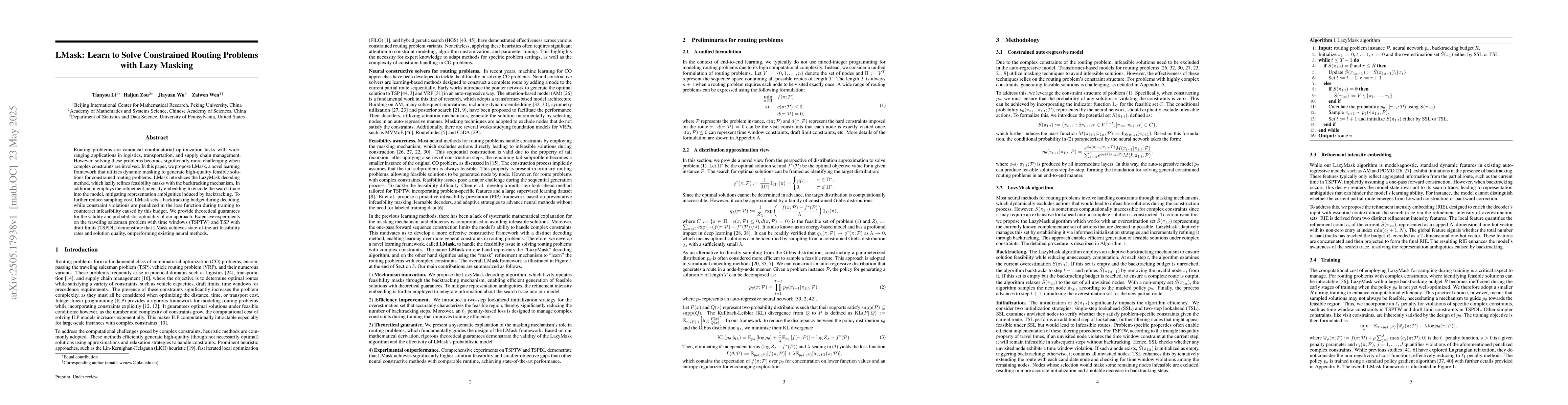 The research proposes LMask, a learning framework utilizing dynamic masking for constrained routing problems, employing LazyMask decoding and refinement intensity embedding to enhance feasibility and solution quality.