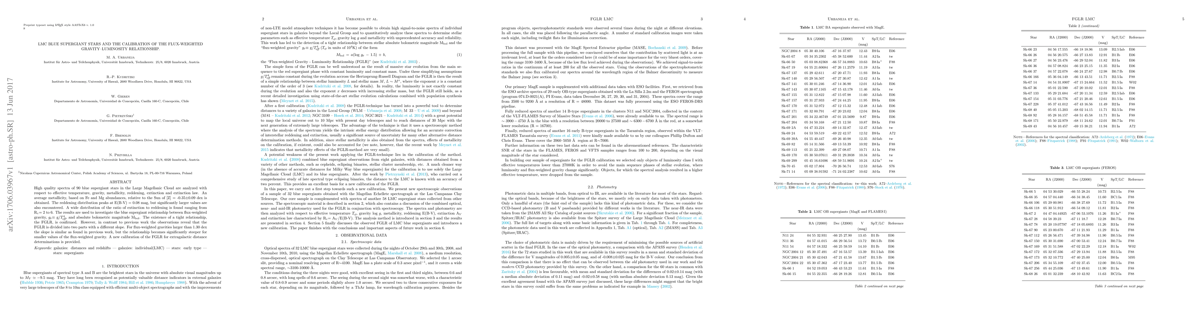 The study analyzes 90 LMC blue supergiant stars' spectra, finding an average metallicity of [Z] = -0.35 +/- 0.09 dex relative to the Sun. A wide range in reddening and extinction-to-reddening ratio is observed. The research confirms the Flux-weighted Gravity--Luminosity Relationship (FGLR), but reveals it consists of two parts with different slopes. A new calibration of FGLR for extragalactic distance determinations is provided.