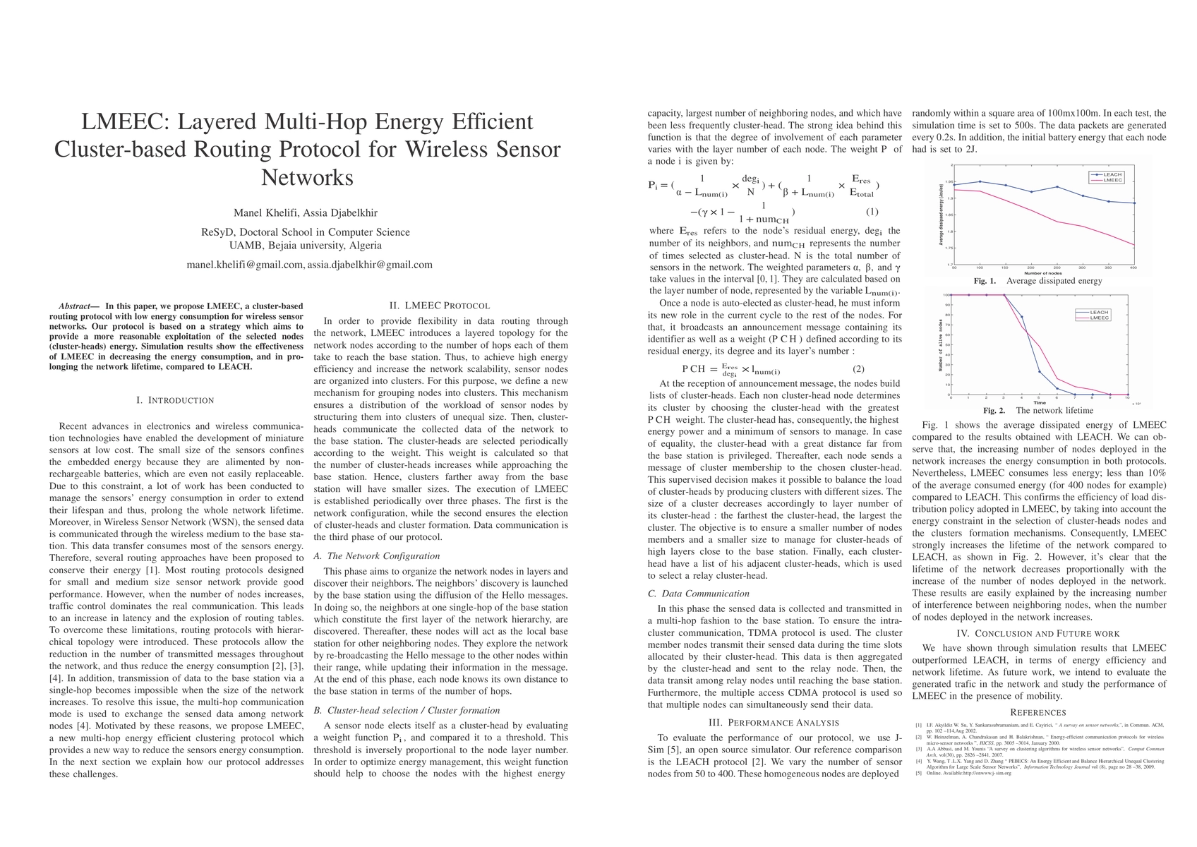 Title: LMEEC: Layered Multi-Hop Energy Efficient Cluster-based Routing Protocol for Wireless Sensor Networks Summary: LMEEC is a proposed cluster-based routing protocol designed to minimize energy consumption in wireless sensor networks by optimizing cluster-head energy usage. Simulation results demonstrate its effectiveness in reducing energy use and extending network lifetime compared to LEACH.