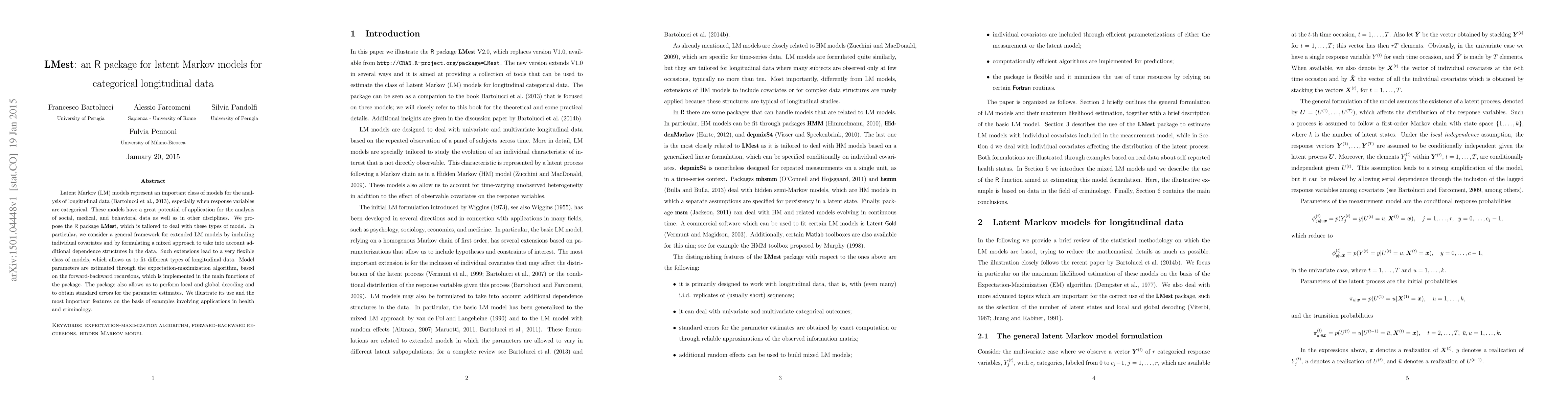 The paper introduces the R package LMest for fitting latent Markov models (LMM) to categorical longitudinal data, extending LMMs by incorporating individual covariates and mixed approaches to capture additional data dependencies. The expectation-maximization algorithm with forward-backward recursions is implemented for parameter estimation.