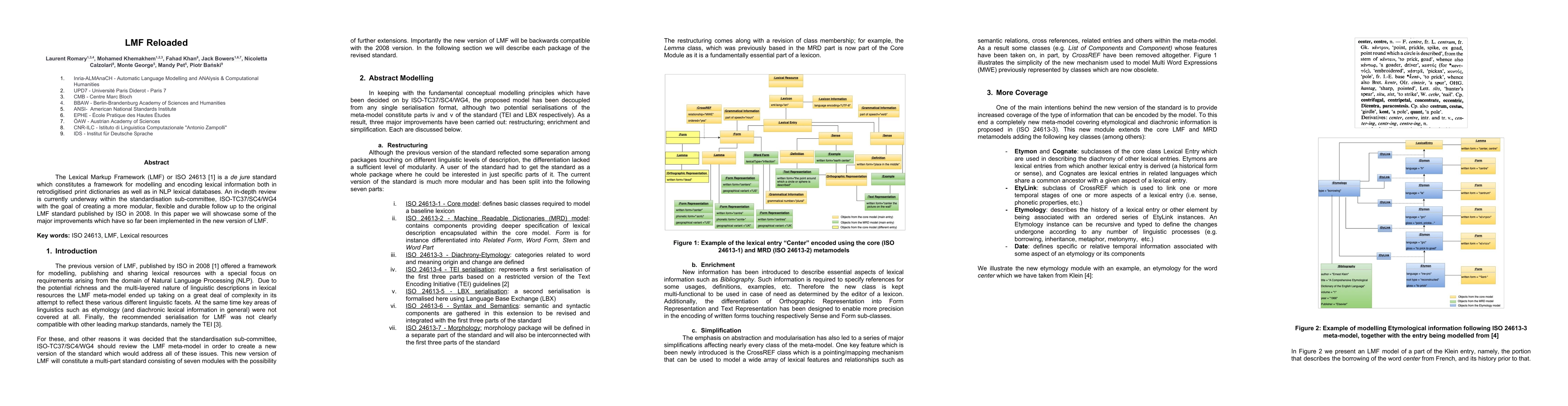 Lexical Markup Framework (LMF) or ISO 24613 [1] is a de jure standard that provides a framework for modelling and encoding lexical information in retrodigitised print dictionaries and NLP lexical databases. An in-depth review is currently underway within the standardisation subcommittee , ISO-TC37/SC4/WG4, to find a more modular, flexible and durable follow up to the original LMF standard published in 2008. In this paper we will present some of the major improvements which have so far been implemented in the new version of LMF.