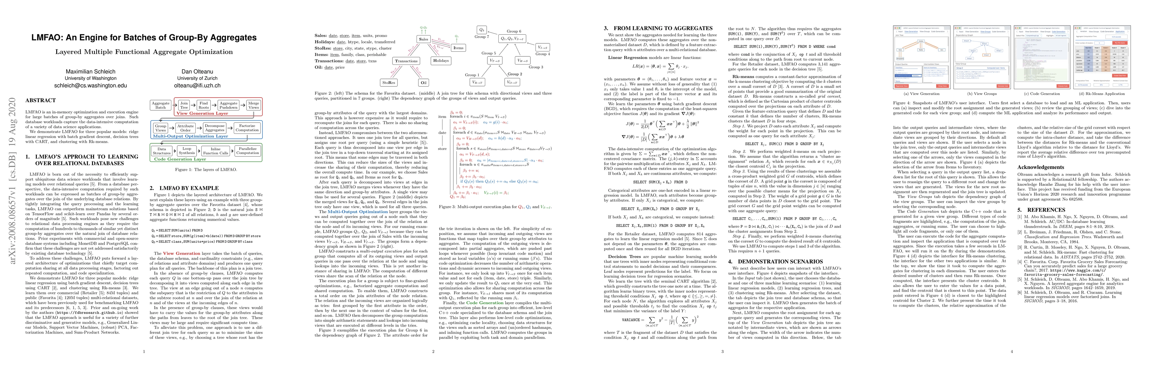 LMFAO is an in-memory engine optimizing large batches of group-by aggregates over joins, crucial for data-intensive computations in data science. It effectively supports ridge linear regression, decision trees via CART, and clustering using Rk-means.