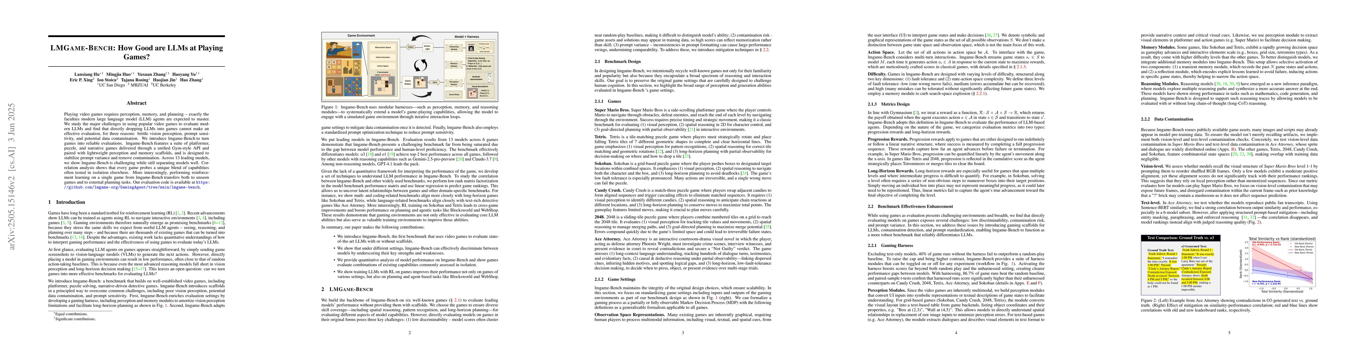 A new benchmark, lmgame-Bench, evaluates large language models (LLMs) at playing games by providing a stable platform with controlled environments, demonstrating that LLMs excel in unique game-specific capabilities.