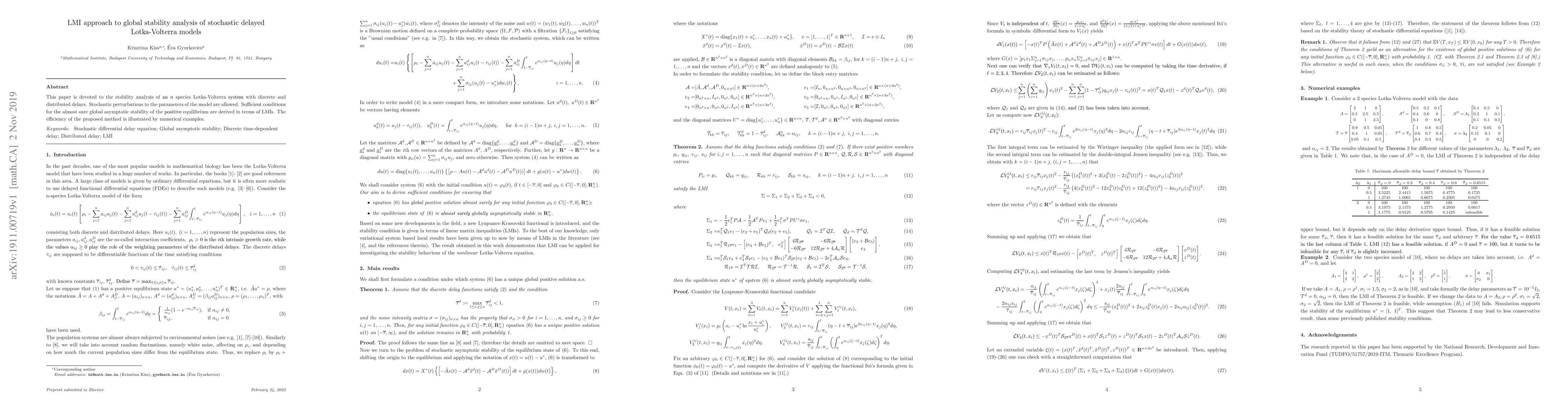 This paper presents an LMI approach for analyzing global stability in stochastic delayed Lotka-Volterra models, deriving conditions for almost sure global asymptotic stability. Numerical examples demonstrate the method's effectiveness.