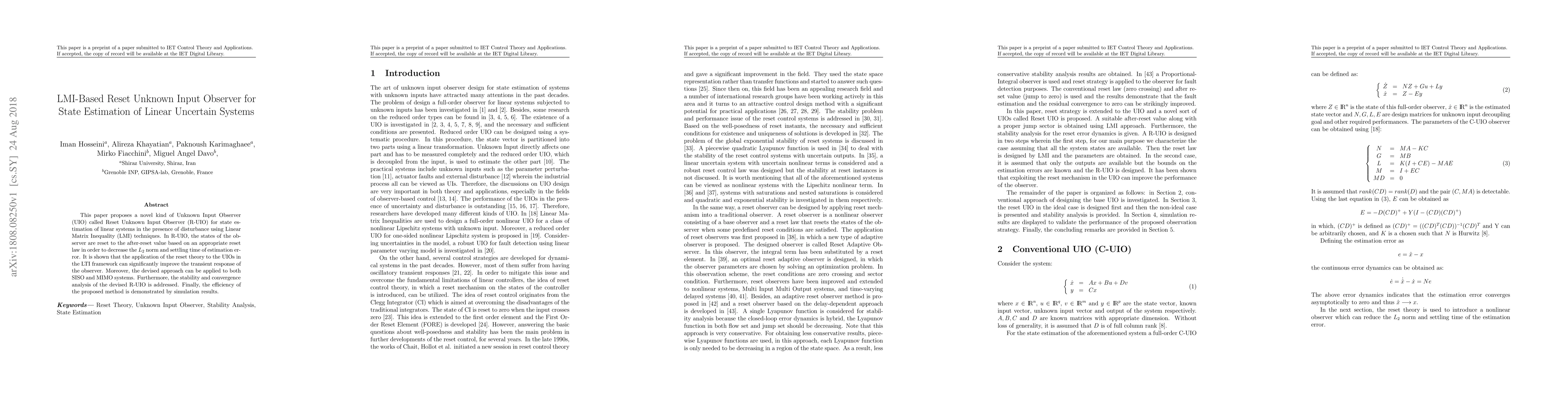 This paper introduces a Reset Unknown Input Observer (R-UIO) for state estimation in linear uncertain systems, employing LMI techniques to enhance transient response. The R-UIO resets observer states to improve $L_2$ norm and settling time, applicable to both SISO and MIMO systems, with stability and convergence analyzed and validated by simulations.