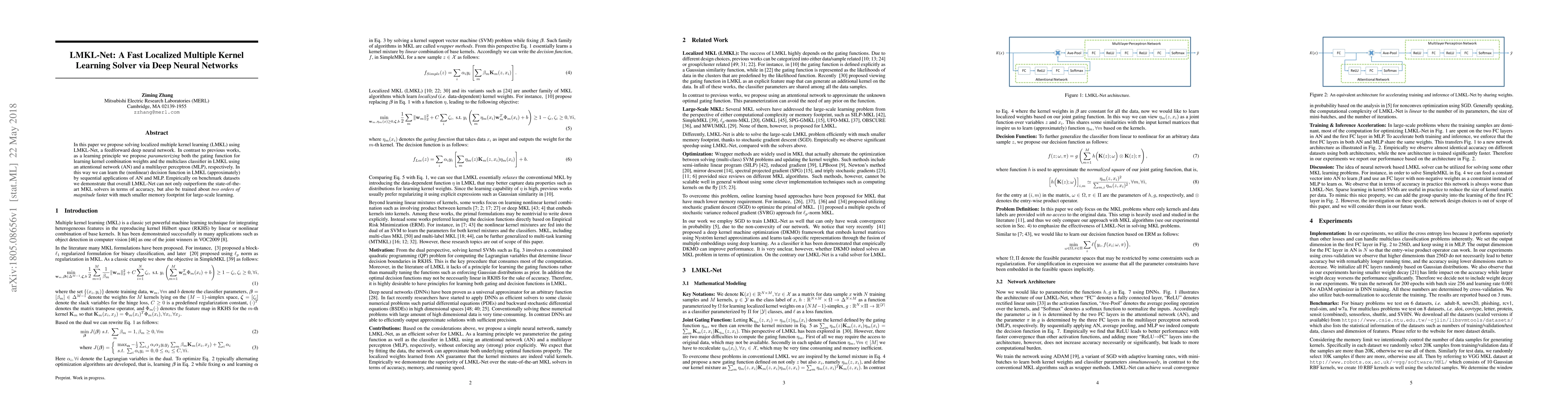 A new method called LMKL-Net uses deep neural networks to solve a machine learning problem faster and more efficiently than existing methods. It achieves this by using attentional networks and multilayer perceptrons to learn complex decision functions.