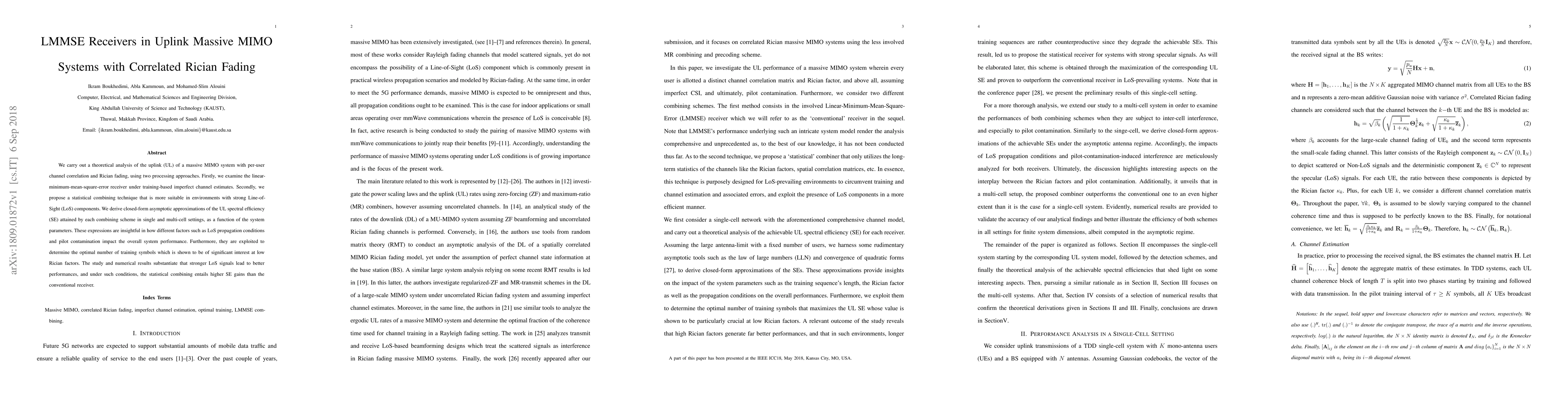 This paper analyzes uplink massive MIMO systems with correlated Rician fading, comparing linear minimum-mean-square-error receivers and a proposed statistical combining technique for strong Line-of-Sight conditions. It derives closed-form approximations for spectral efficiency, revealing the impact of LoS and pilot contamination, and determines the optimal number of training symbols for improved performance.