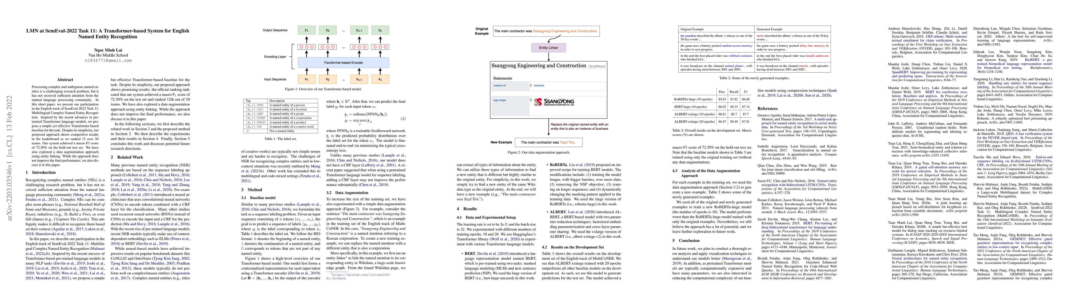 Summary: LMN proposed a Transformer-based model for SemEval-2022 Task 11 on Multilingual Complex Named Entity Recognition, achieving a macro F1 score of 72.50%. Despite its simplicity, the system ranked 12th among 30 teams, demonstrating competitive performance.