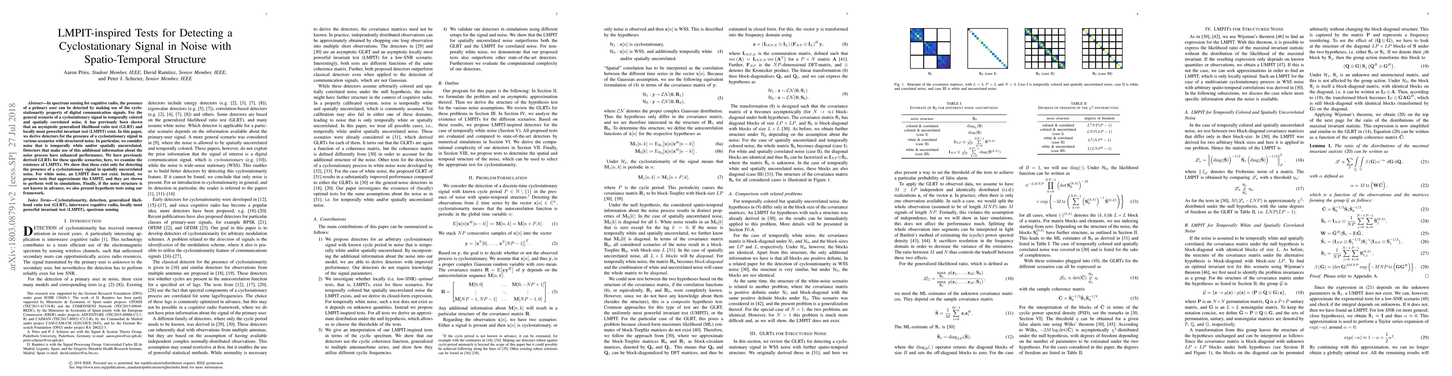 Researchers developed LMPIT-inspired tests to detect cyclostationary signals in noise with spatio-temporal structure, showing that these tests exist only for spatially uncorrelated noise and offer improved performance.