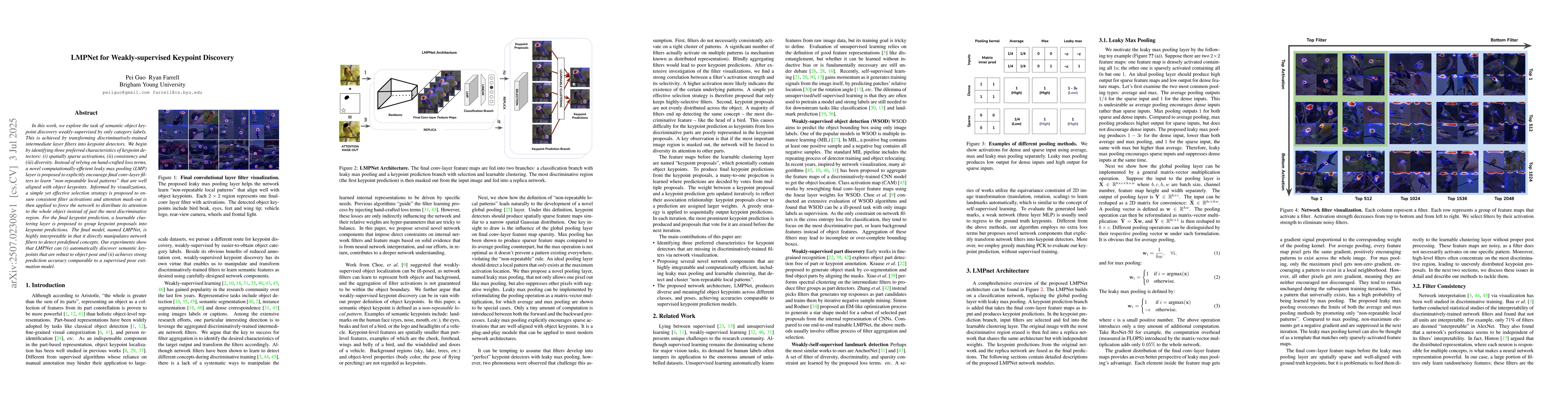 In this work, we explore the task of semantic object keypoint discovery weakly-supervised by only category labels. This is achieved by transforming discriminatively-trained intermediate layer filters into keypoint detectors. We begin by identifying three preferred characteristics of keypoint detectors: (i) spatially sparse activations, (ii) consistency and (iii) diversity. Instead of relying on hand-crafted loss terms, a novel computationally-efficient leaky max pooling (LMP) layer is proposed to explicitly encourage final conv-layer filters to learn "non-repeatable local patterns" that are well aligned with object keypoints. Informed by visualizations, a simple yet effective selection strategy is proposed to ensure consistent filter activations and attention mask-out is then applied to force the network to distribute its attention to the whole object instead of just the most discriminative region. For the final keypoint prediction, a learnable clustering layer is proposed to group keypoint proposals into keypoint predictions. The final model, named LMPNet, is highly interpretable in that it directly manipulates network filters to detect predefined concepts. Our experiments show that LMPNet can (i) automatically discover semantic keypoints that are robust to object pose and (ii) achieves strong prediction accuracy comparable to a supervised pose estimation model.