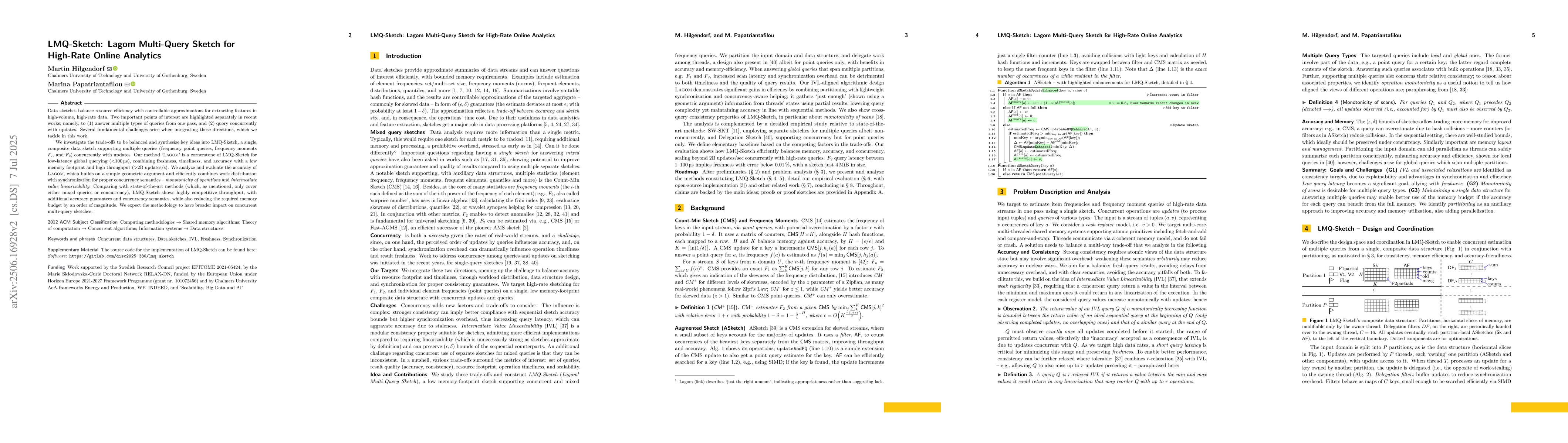 Data sketches balance resource efficiency with controllable approximations for extracting features in high-volume, high-rate data. Two important points of interest are highlighted separately in recent works; namely, to (1) answer multiple types of queries from one pass, and (2) query concurrently with updates. Several fundamental challenges arise when integrating these directions, which we tackle in this work. We investigate the trade-offs to be balanced and synthesize key ideas into LMQ-Sketch, a single, composite data sketch supporting multiple queries (frequency point queries, frequency moments F1, and F2) concurrently with updates. Our method 'Lagom' is a cornerstone of LMQ-Sketch for low-latency global querying (<100 us), combining freshness, timeliness, and accuracy with a low memory footprint and high throughput (>2B updates/s). We analyze and evaluate the accuracy of Lagom, which builds on a simple geometric argument and efficiently combines work distribution with synchronization for proper concurrency semantics -- monotonicity of operations and intermediate value linearizability. Comparing with state-of-the-art methods (which, as mentioned, only cover either mixed queries or concurrency), LMQ-Sketch shows highly competitive throughput, with additional accuracy guarantees and concurrency semantics, while also reducing the required memory budget by an order of magnitude. We expect the methodology to have broader impact on concurrent multi-query sketches.