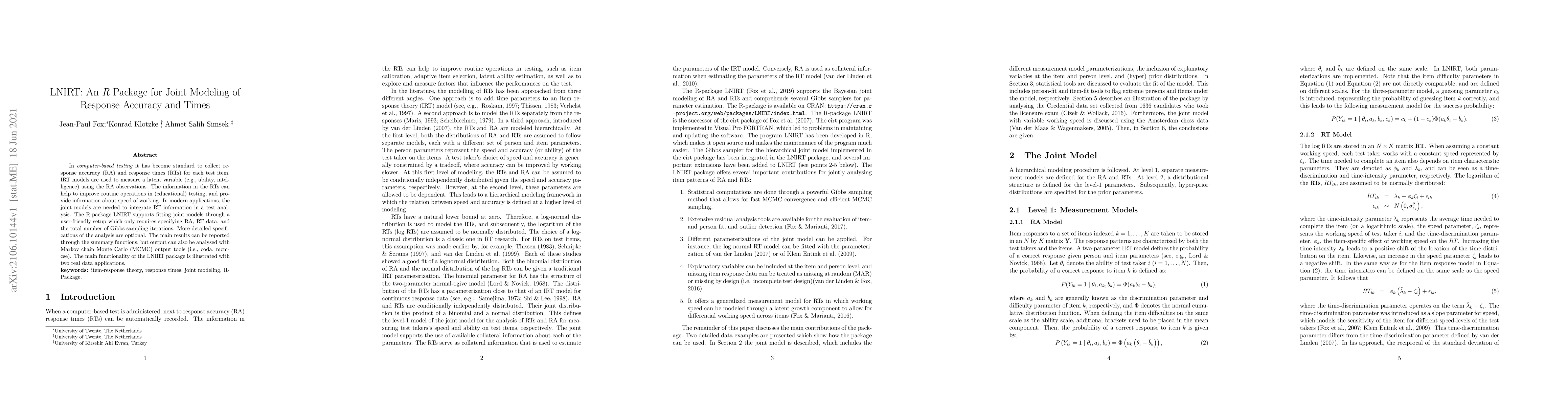 A new R package called LNIRT enables joint modeling of response accuracy and times in computer-based testing, providing insights into speed of working and improving routine operations. It offers a user-friendly setup for analyzing RT data and allows for the integration of RT information with RA observations.