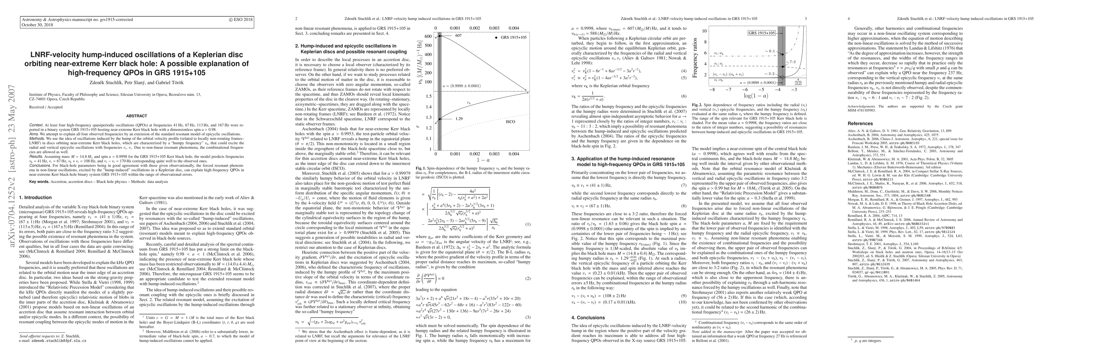 This paper proposes that high-frequency quasiperiodic oscillations (QPOs) in GRS 1915+105, a binary system with a near-extreme Kerr black hole, are caused by oscillations induced by the "hump" in the orbital velocity profile of the Keplerian disc. The model aligns predicted frequencies with observed QPOs, suggesting that non-linear resonant phenomena in the disc's oscillations can explain these phenomena.