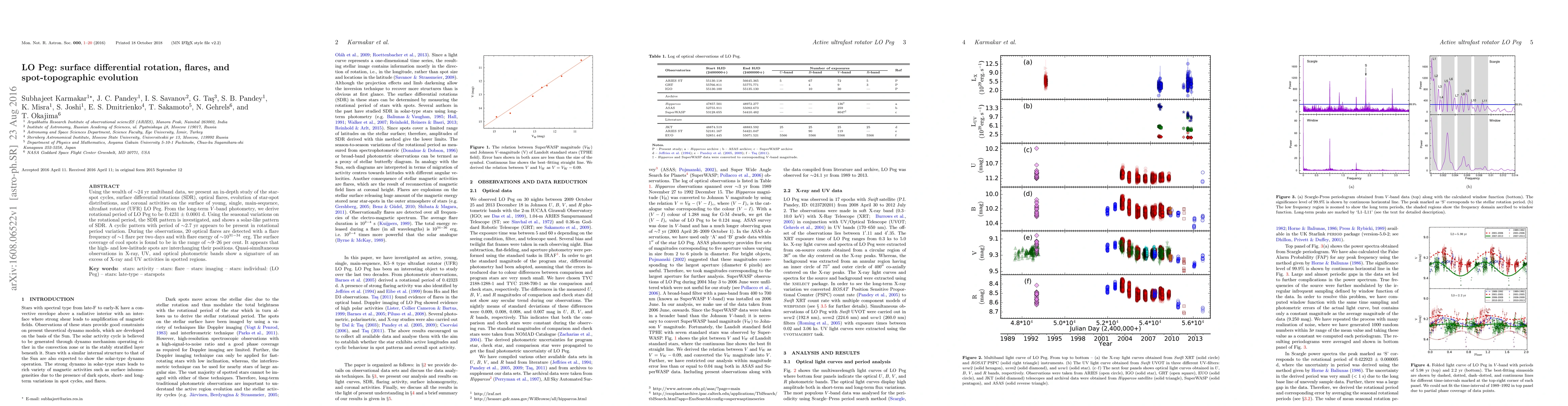 Using the wealth of ~24 yr multiband data, we present an in-depth study of the star-spot cycles, surface differential rotations (SDR), optical flares, evolution of star-spot distributions, and coronal activities on the surface of young, single, main-sequence, ultrafast rotator (UFR) LO Peg. From the long-term V -band photometry, we derive rotational period of LO Peg to be 0.4231 +/- 0.0001 d. Using the seasonal variations on the rotational period, the SDR pattern is investigated, and shows a solar-like pattern of SDR. A cyclic pattern with period of ~2.7 yr appears to be present in rotational period variation. During the observations, 20 optical flares are detected with a flare frequency of 1 flare per two days and with flare energy of 10^{31-34} erg. The surface coverage of cool spots is found to be in the range of 9-26 per cent. It appears that the high- and low-latitude spots are interchanging their positions. Quasi-simultaneous observations in X-ray, UV, and optical photometric bands show a signature of an excess of X-ray and UV activities in spotted regions.