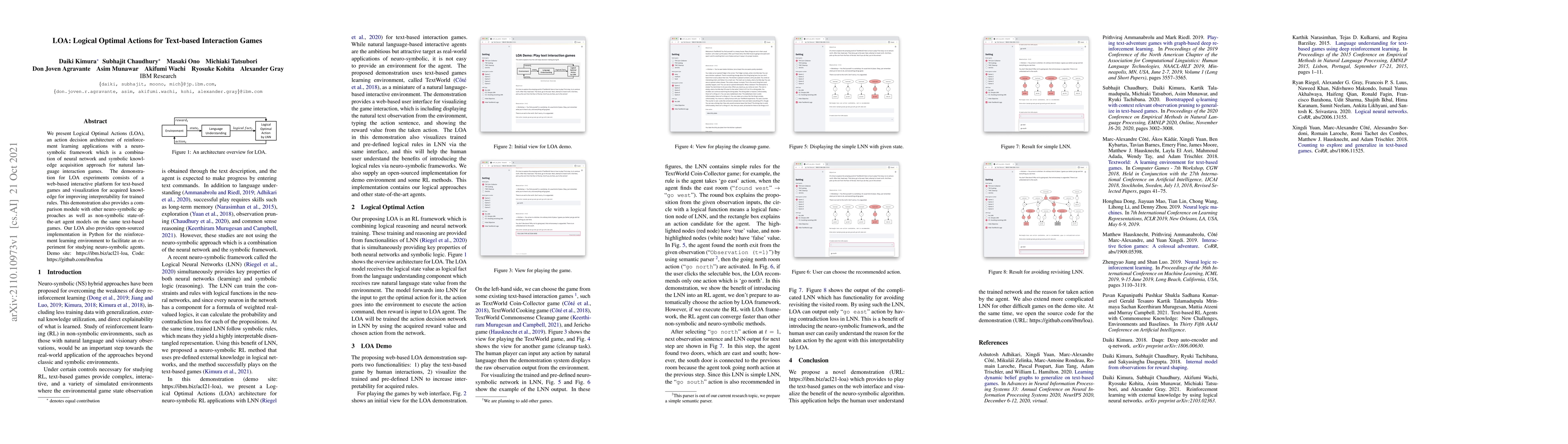 We present Logical Optimal Actions (LOA), an action decision architecture of reinforcement learning applications with a neuro-symbolic framework which is a combination of neural network and symbolic knowledge acquisition approach for natural language interaction games. The demonstration for LOA experiments consists of a web-based interactive platform for text-based games and visualization for acquired knowledge for improving interpretability for trained rules. This demonstration also provides a comparison module with other neuro-symbolic approaches as well as non-symbolic state-of-the-art agent models on the same text-based games. Our LOA also provides open-sourced implementation in Python for the reinforcement learning environment to facilitate an experiment for studying neuro-symbolic agents. Code: https://github.com/ibm/loa