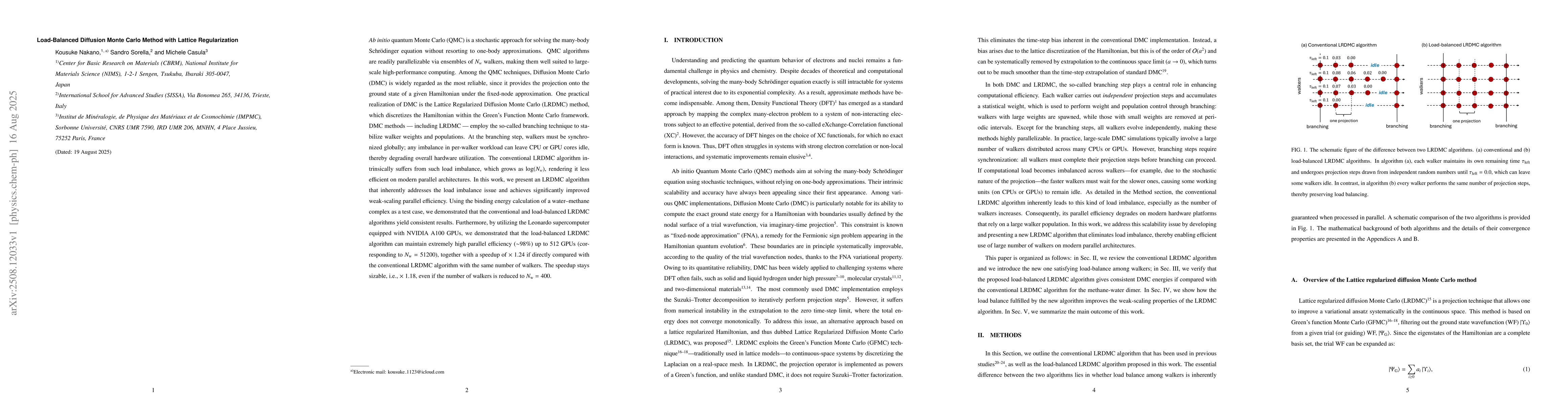 Ab initio quantum Monte Carlo (QMC) is a stochastic approach for solving the many-body Schr\"odinger equation without resorting to one-body approximations. QMC algorithms are readily parallelizable via ensembles of $N_w$ walkers, making them well suited to large-scale high-performance computing. Among the QMC techniques, Diffusion Monte Carlo (DMC) is widely regarded as the most reliable, since it provides the projection onto the ground state of a given Hamiltonian under the fixed-node approximation. One practical realization of DMC is the Lattice Regularized Diffusion Monte Carlo (LRDMC) method, which discretizes the Hamiltonian within the Green's Function Monte Carlo framework. DMC methods - including LRDMC - employ the so-called branching technique to stabilize walker weights and populations. At the branching step, walkers must be synchronized globally; any imbalance in per-walker workload can leave CPU or GPU cores idle, thereby degrading overall hardware utilization. The conventional LRDMC algorithm intrinsically suffers from such load imbalance, which grows as $\log(N_w)$, rendering it less efficient on modern parallel architectures. In this work, we present an LRDMC algorithm that inherently addresses the load imbalance issue and achieves significantly improved weak-scaling parallel efficiency. Using the binding energy calculation of a water-methane complex as a test case, we demonstrated that the conventional and load-balanced LRDMC algorithms yield consistent results. Furthermore, by utilizing the Leonardo supercomputer equipped with NVIDIA A100 GPUs, we demonstrated that the load-balanced LRDMC algorithm can maintain extremely high parallel efficiency ($\sim$98\%) up to 512 GPUs (corresponding to $N_{\rm w}= 51200$), together with a speedup of $\times~1.24$ if directly compared with the conventional LRDMC algorithm with the same number of walkers.