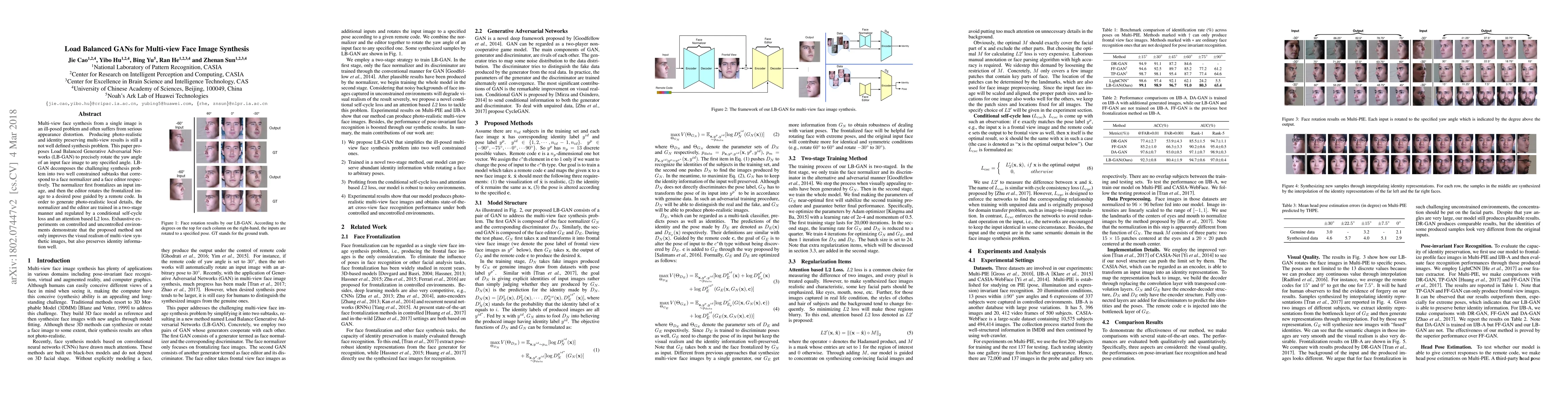 This paper proposes Load Balanced GANs (LB-GAN) to synthesize photo-realistic multi-view face images from a single input, decomposing the task into frontalization and pose rotation subtasks. The method improves visual realism and identity preservation through a two-stage training approach.