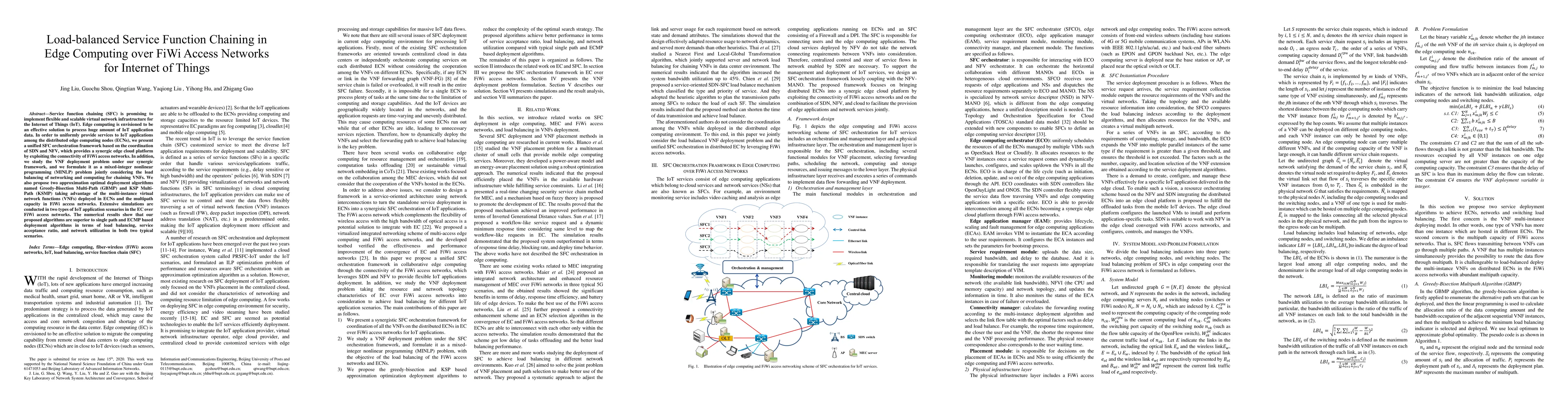 This paper presents a unified orchestration framework for service function chaining in edge computing over FiWi networks to serve IoT applications, proposing two optimization algorithms for load-balanced deployment of virtual network functions. Simulation results demonstrate superior performance of the proposed algorithms in load balancing and network utilization compared to existing methods.