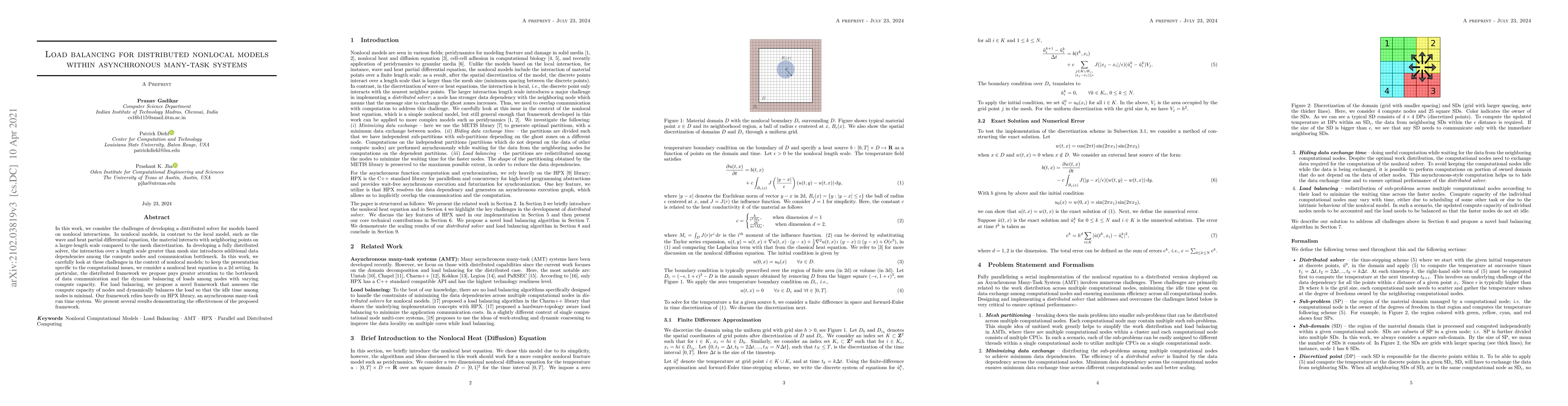 This paper presents a distributed solver for nonlocal models, focusing on addressing data dependencies and communication bottlenecks in asynchronous many-task systems. It proposes a novel load balancing framework that dynamically adjusts compute loads among nodes to minimize idle time, leveraging the HPX library for efficient computation.