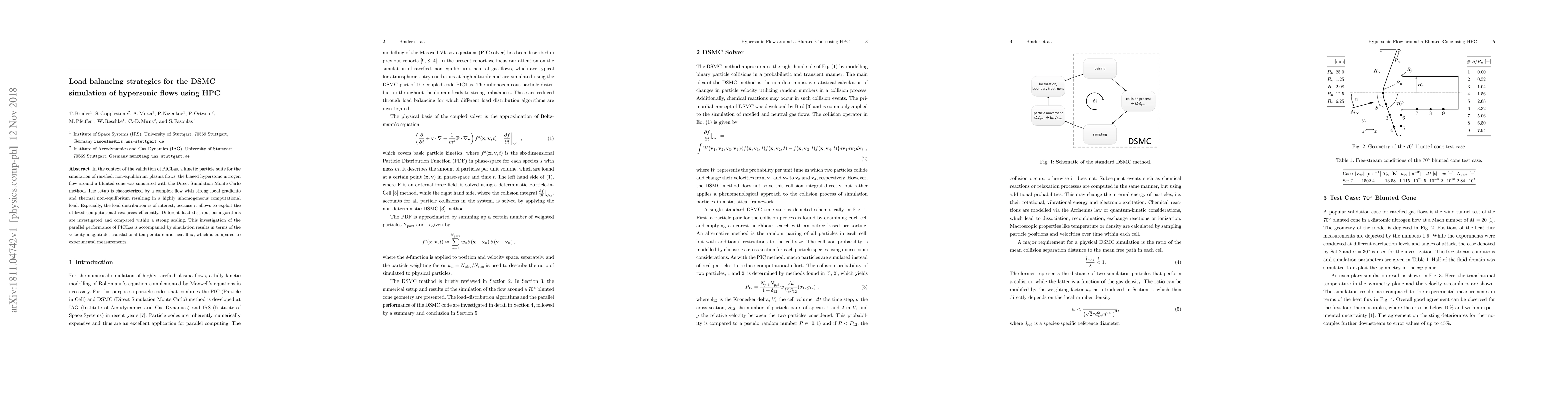 This paper investigates load balancing strategies for the Direct Simulation Monte Carlo (DSMC) simulation of hypersonic nitrogen flows using high-performance computing (HPC). It evaluates various load distribution algorithms for efficient resource utilization in PICLas, a kinetic particle suite, and compares their performance through strong scaling and simulation results against experimental data.